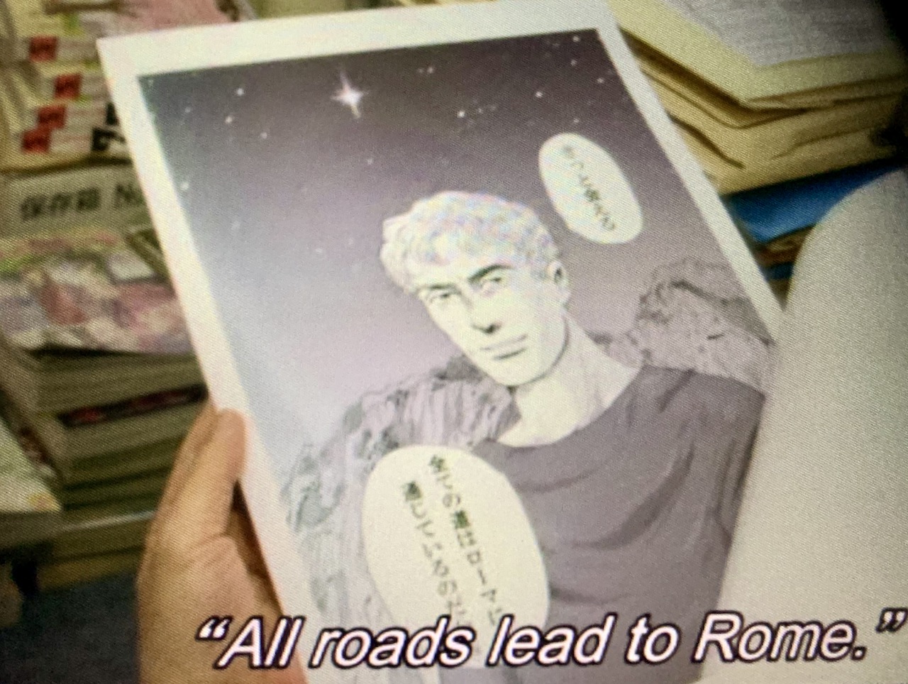 Ensuite dans le vol de retour (Haneda-Frankfurt), je tombe sur le film japonais <Thermae Romae>, basé sur le manga du même titre, avec Abe Hiroshi, Ueto Aya et surtout Sasano Takashi et Ichimura Masachika. Une histoire complètement stupide avec ces acteurs japonais qui jouent le rôle des Romains, mais c’est tellement plein de détails super drôles et les acteurs (surtout la bande des papis ) sont super sympas. J’ai bien aimé le film. Peut-être que je devrais lire les mangas de Yamazaki Mari.