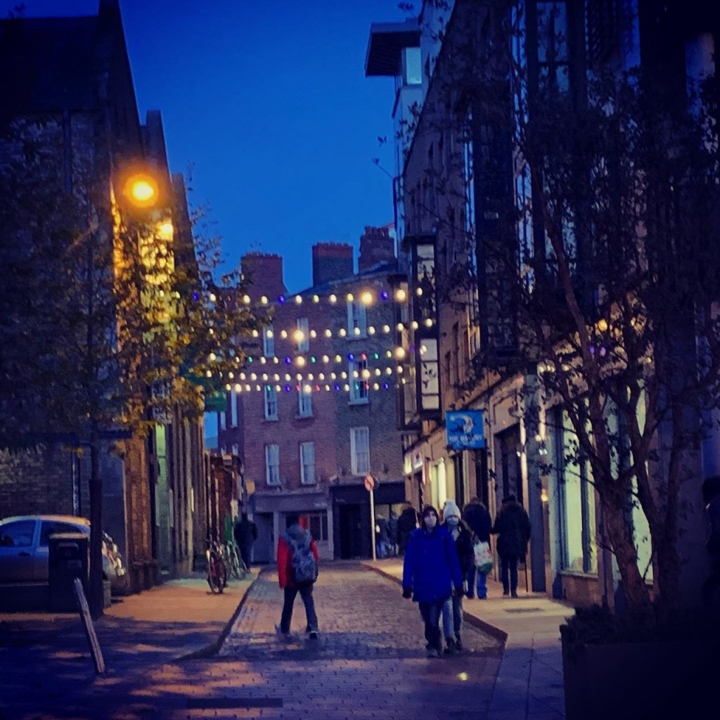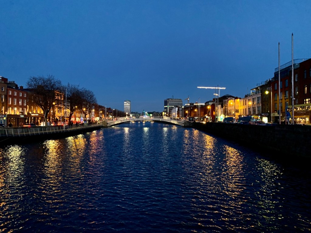 Vedredi 10 Décembre. Bernie avait un rendez-vous à l’hôpital et moi chez ma coiffeuse à Dublin, alors on s’est retrouvés dans la soirée au centre ville. En sortant de chez la coiffeuse, j’ai fait un petit tour le long de la Liffey (prononcé Liffi). Sur le quai de la rivière et sur les ponts piétons, il y avait beaucoup de monde, surtout des jeunes qui se promenaient. La nuit tombait, la lune très claire dans le ciel.