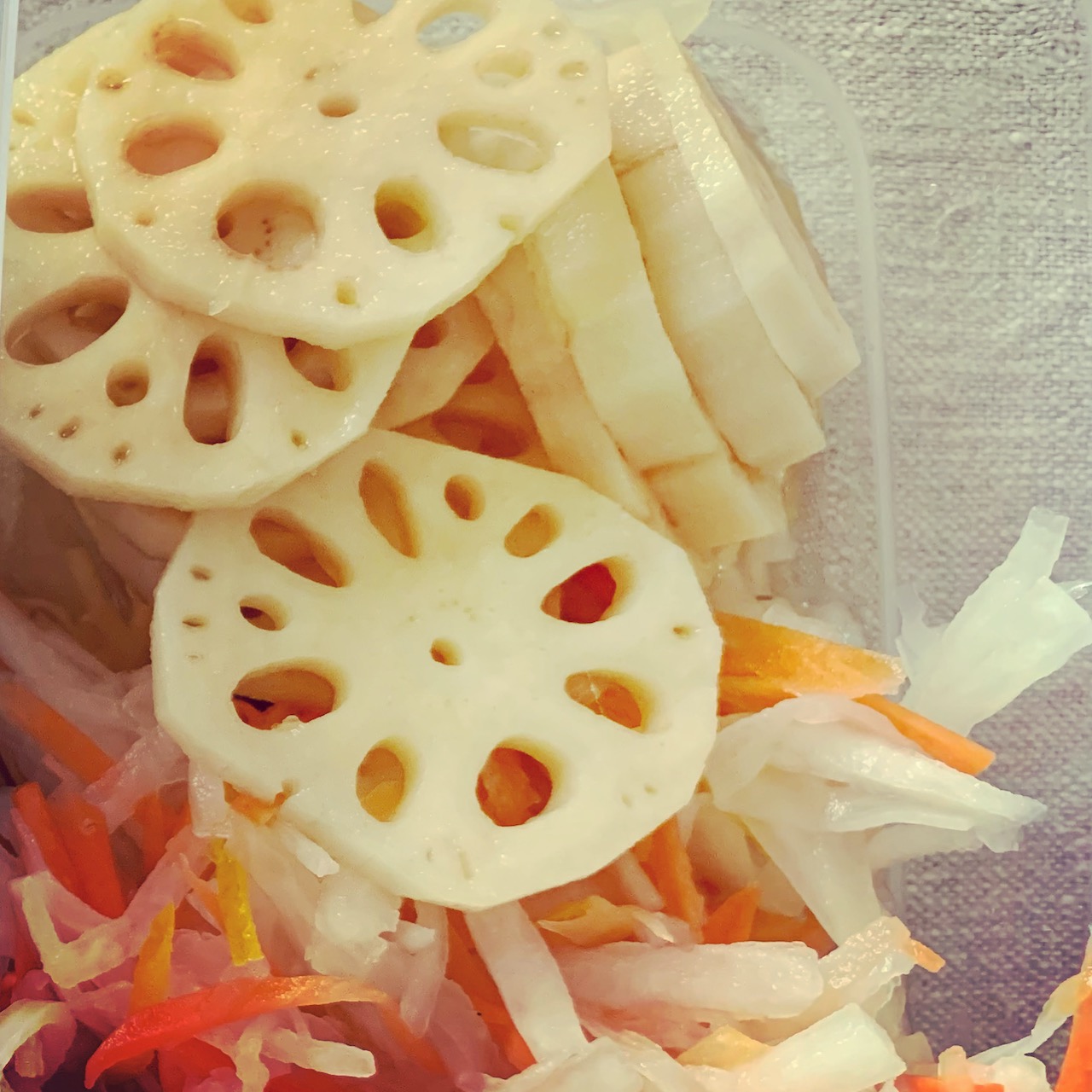 松の内を過ぎてしまいましたが、今日は午後から友だちにお節っぽいおかずを届ける約束をしたので、昨日はまた椎茸煮から里芋、鶏団子を作りました。あと酢蓮と大根のなますを。にんじんでお花にしようと思ったらインベーダーみたいになってしまった