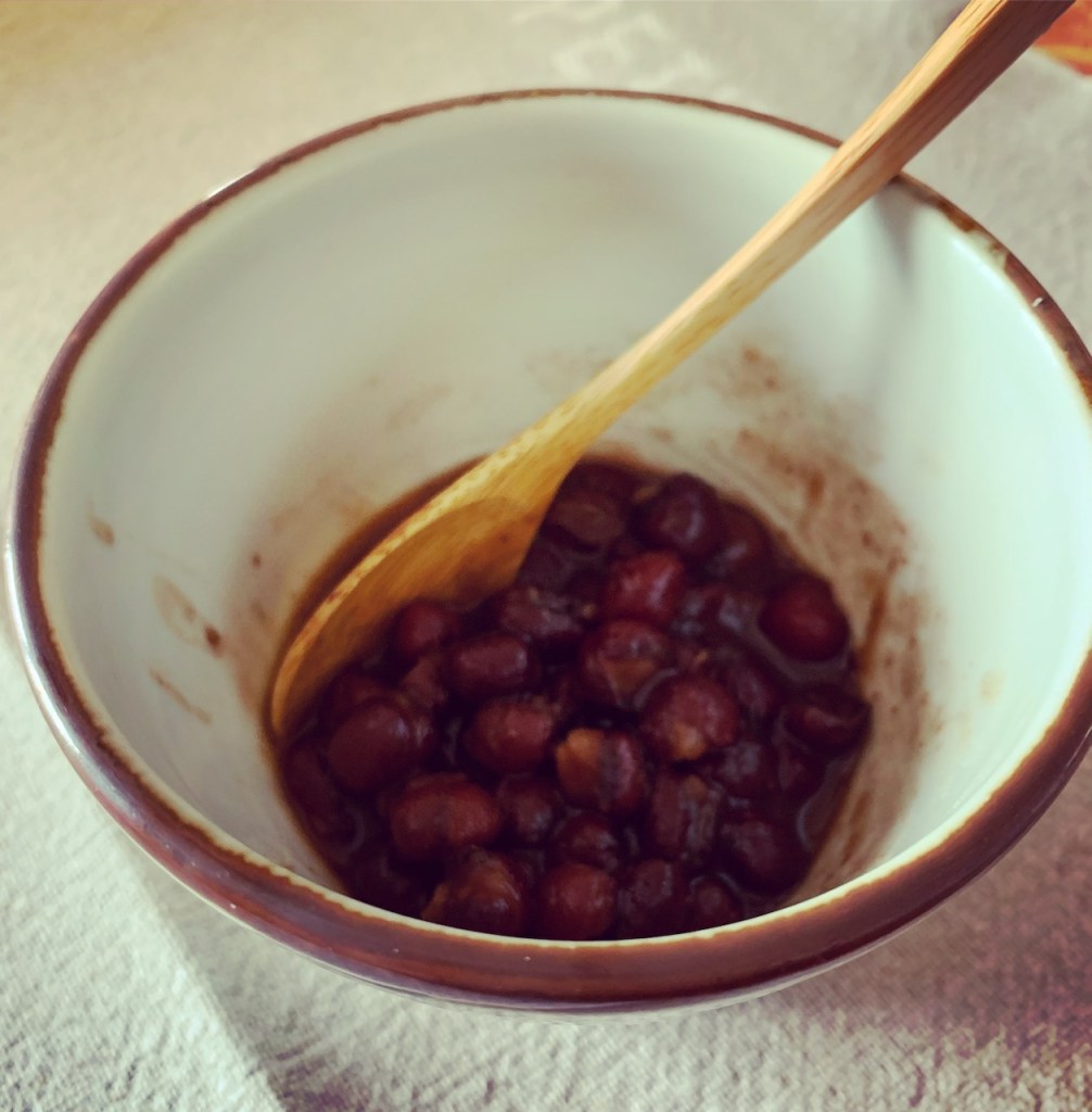 このあいだ、急に思いついて、冷やご飯に混ぜて少し煮て、小豆粥にしました。