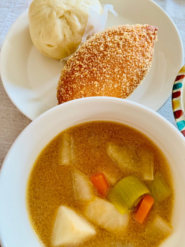 Gopanさんが日本から戻られてはじめて、カレーパンや肉まん、ソーセージロールを届けてくださったので、野菜いっぱいのけんちん汁でランチ。