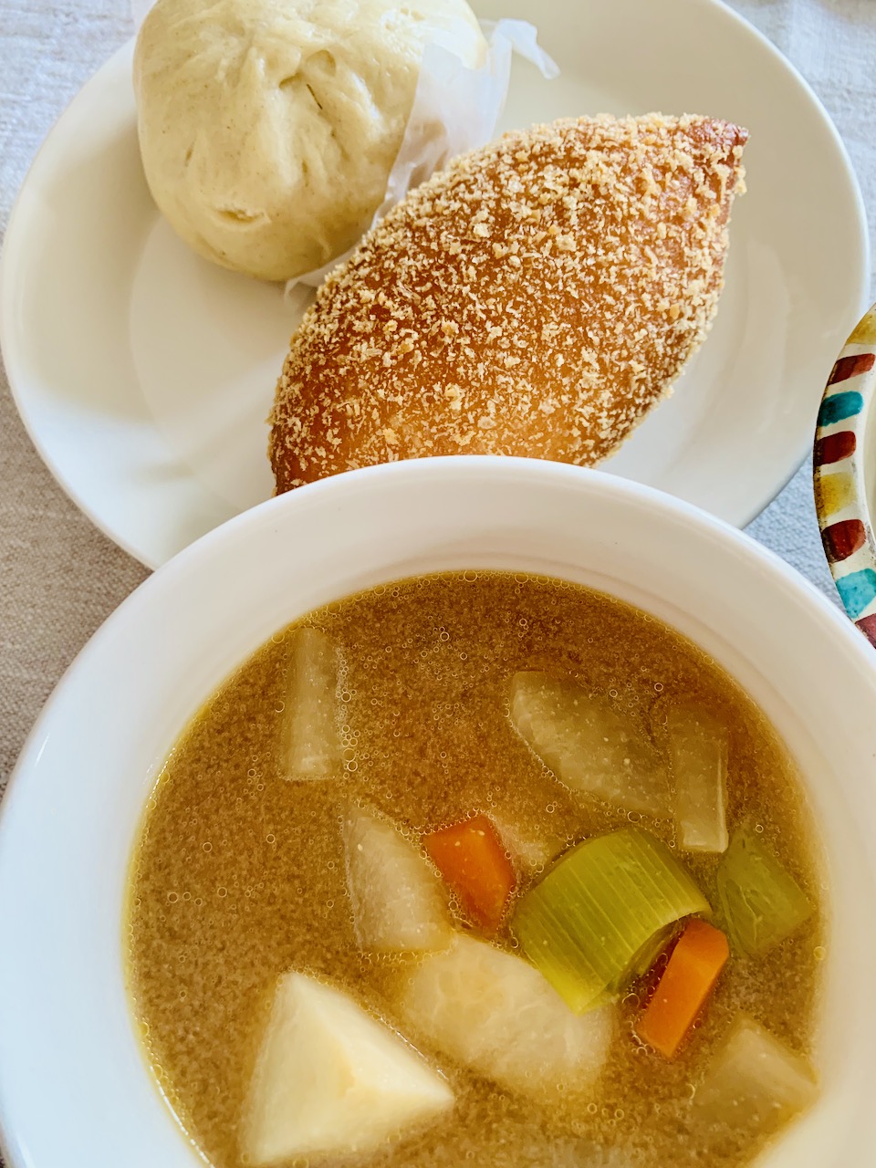 Gopanさんが日本から戻られてはじめて、カレーパンや肉まん、ソーセージロールを届けてくださったので、野菜いっぱいのけんちん汁でランチ。