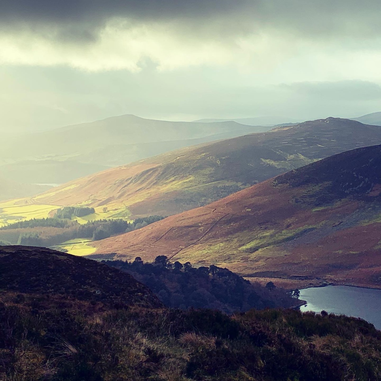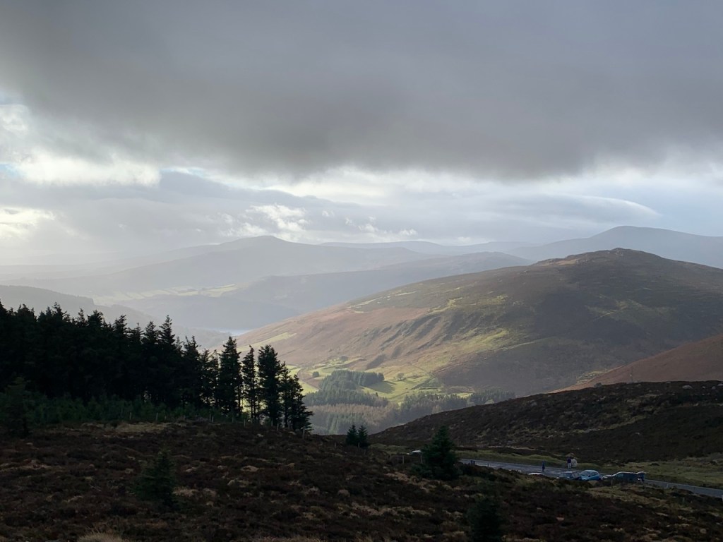 ウイックロウの山々の重なりと谷を照らす冬の光が美しい。