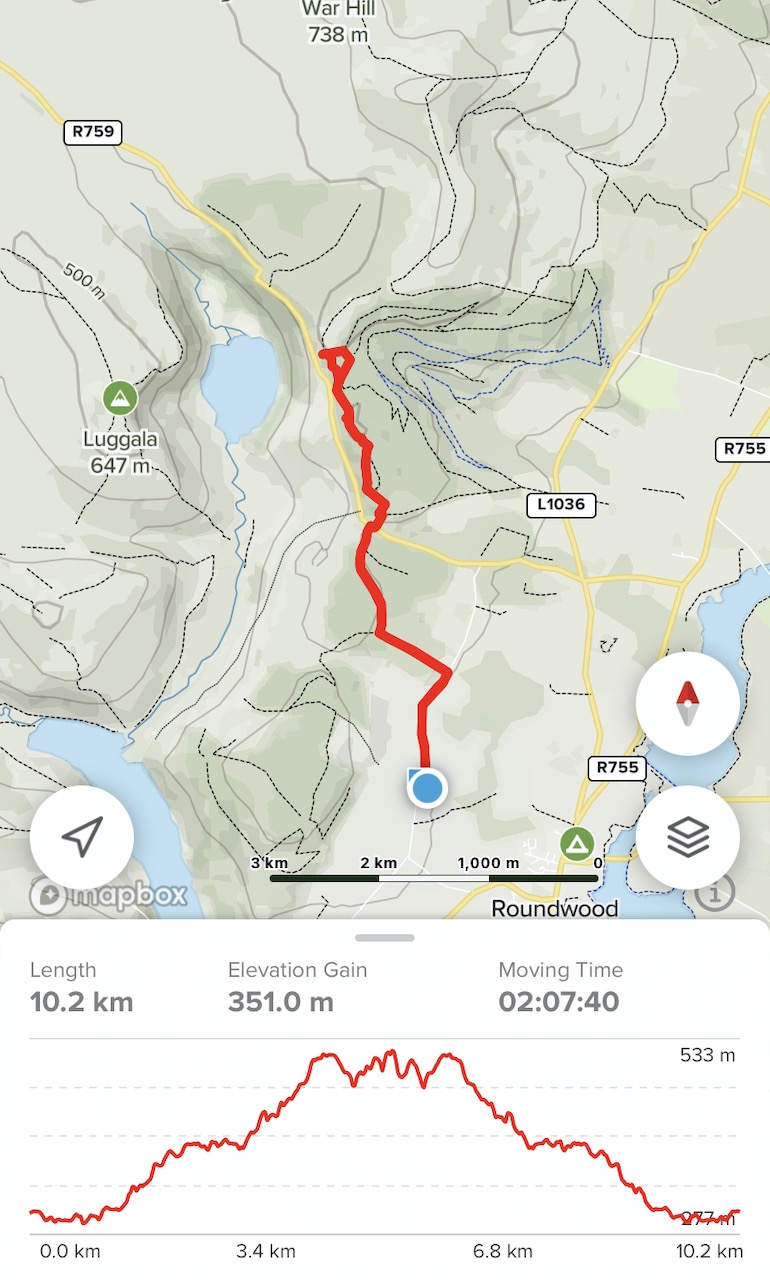 家からウイックロウウェイ経由でLough Tayを見渡す高台まで、往復10.2 km 標高差351m。