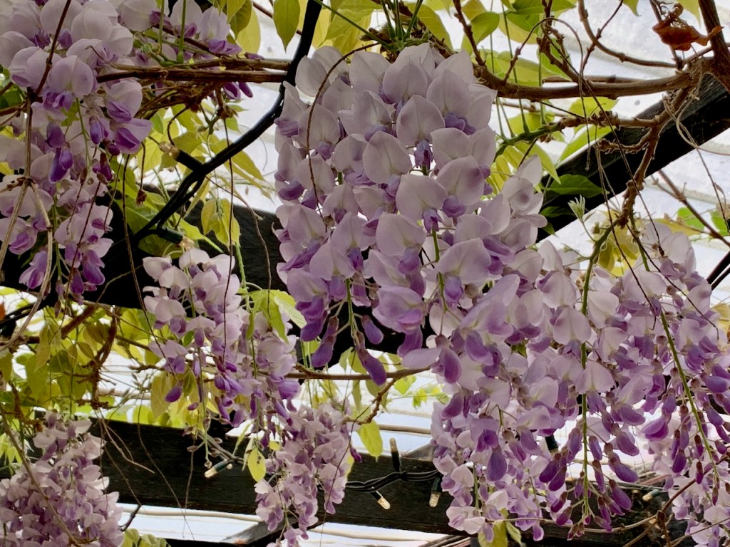 帰りに立ち寄るカフェは藤の花が満開。そしてブルーベルの花もちらほら見られる季節です。