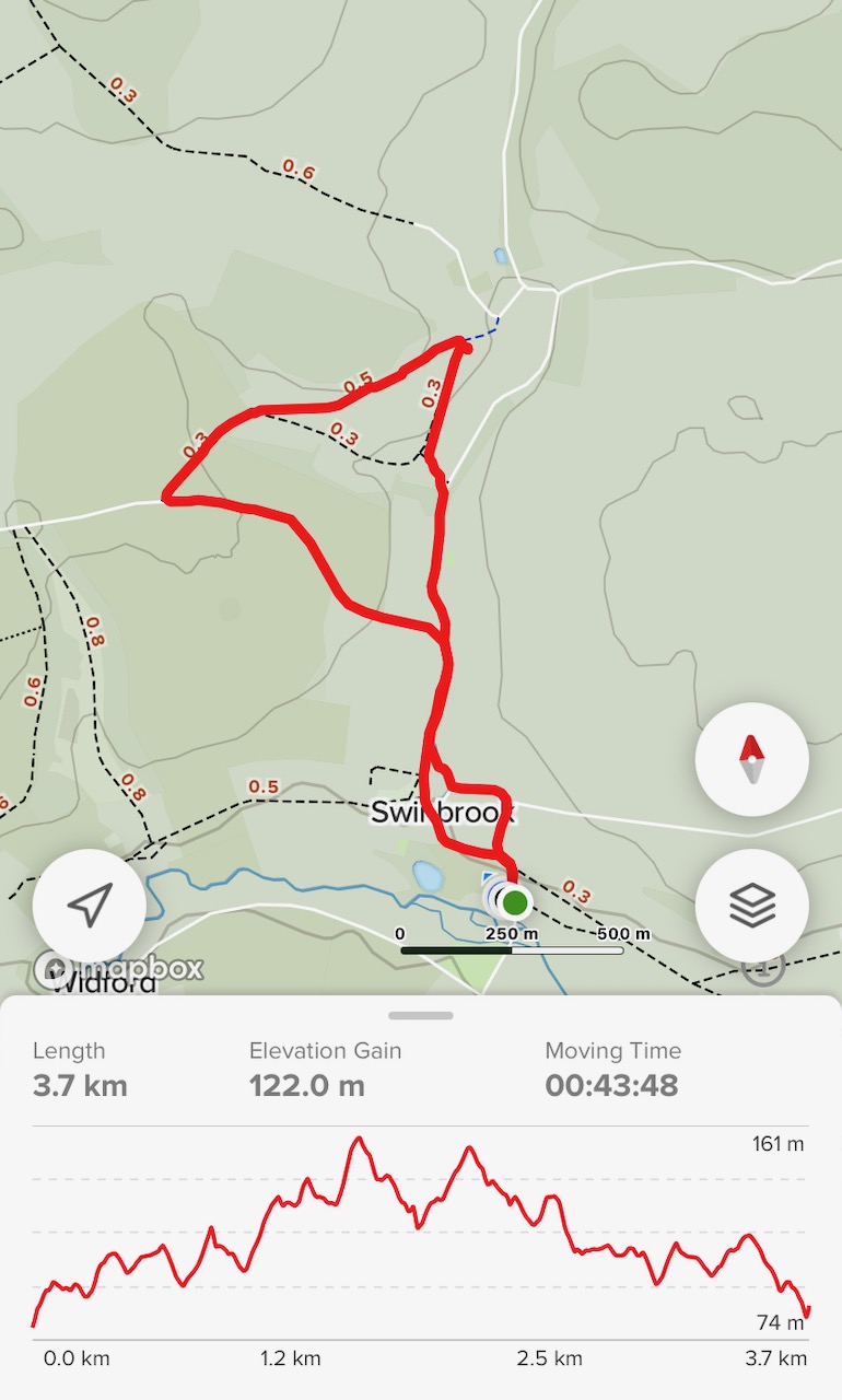 Sat 22 May 2022. Quick walk in Swinbrook before checking out. Lovely up and down walk, 3.7 km elevation gain 122m