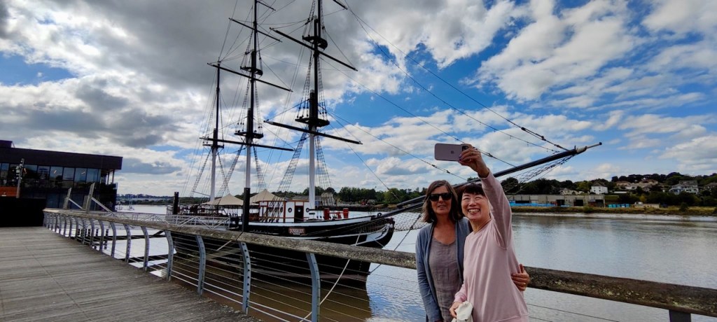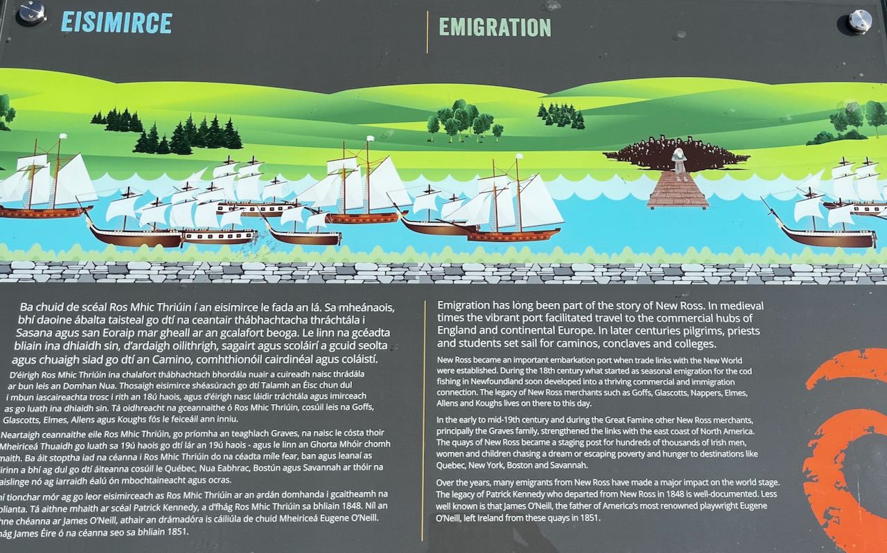 後ろに映ってる船は、ニューロスの河港にある 昔の移民船を少し縮小して復元したものだそうです。ジャガイモ飢饉のとき、ここからたくさんのアイルランドの人たちがイギリス本土やヨーロッパや新大陸へ向けて命からがら移民したのです。ケネディの祖先もここからボストンへ行ったのです。