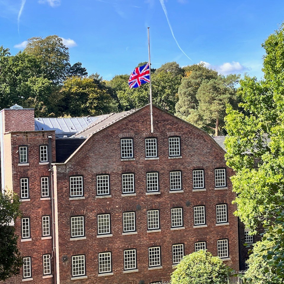 紡績工場の建物に掲げられた国旗は、半旗でした。