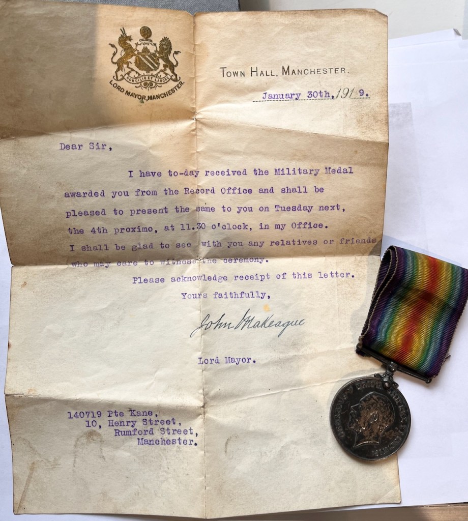 第1次世界大戦に従軍してドイツ軍の捕虜となり、キャンプで軍用犬に足のつま先を噛み切られるという大怪我をしたが、生きて戻った。戻ったあと勲章をもらった。マンチェスタの市長から「授与式を行う」知らせ(右上)を受け取った(1919年1月30日付)。また 国王ジョージ5世(エリザベス2世の祖父)からもらった手紙も。(今だったらタイプの文面でしょうね?)しかし健康状態があまり良くなくて、早くに亡くなった。