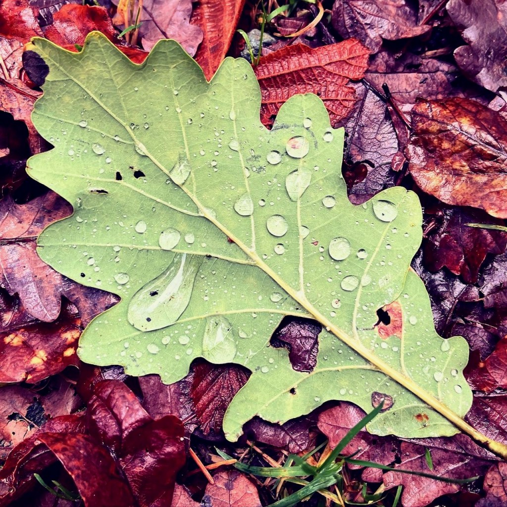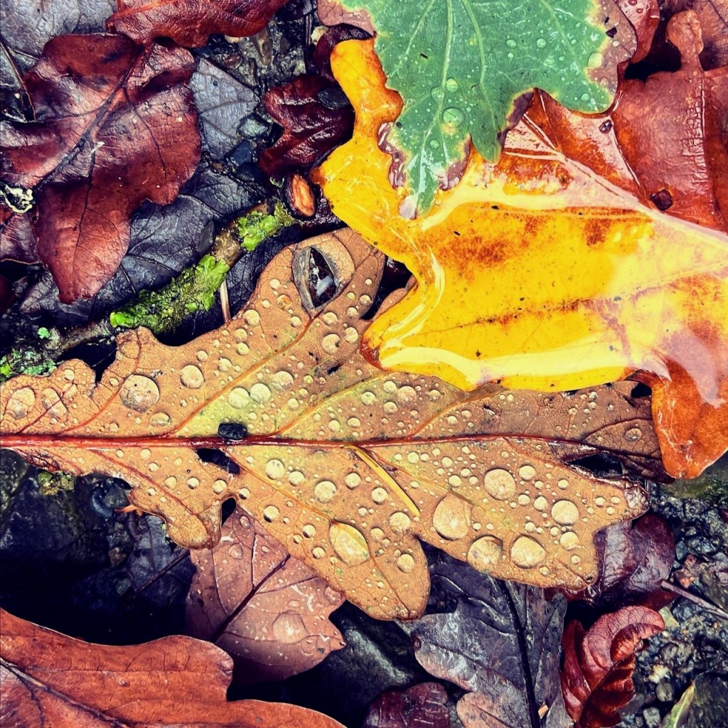 歩きながら思わず地面に落ちてる葉っぱの美しさ、雨粒が溜まってる可愛らしさにとらわれました。