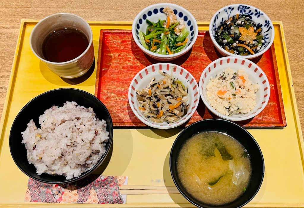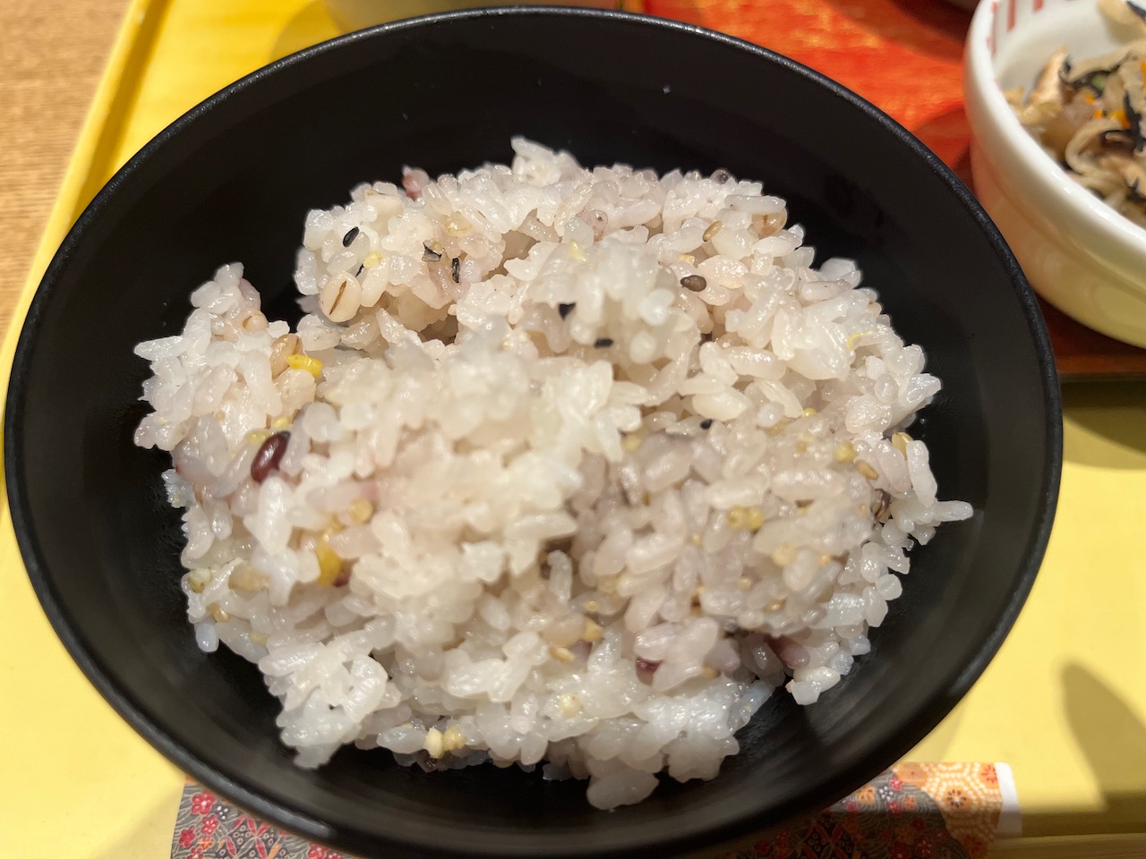 ご飯セット700円で、たくさんの種類の野菜のお料理の小鉢を、4つ選んでつけてもらう。ご飯も白米か雑穀の入ったご飯か選べる。sachanはいつも十穀米。
