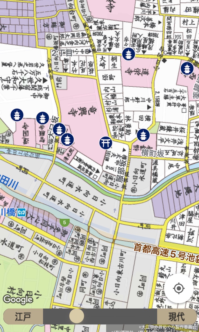 現在と昔を重ねて見られる地図のアプリで見ると、とても興味深い。