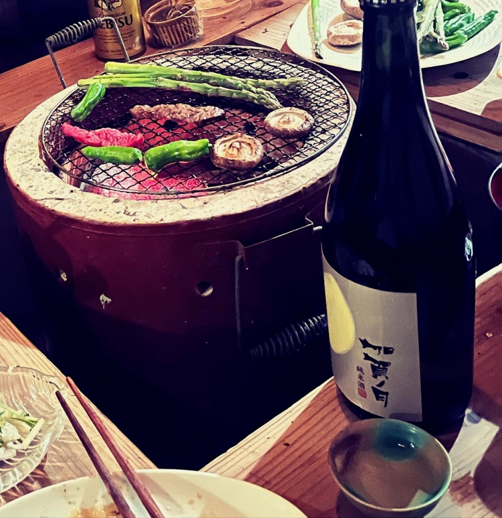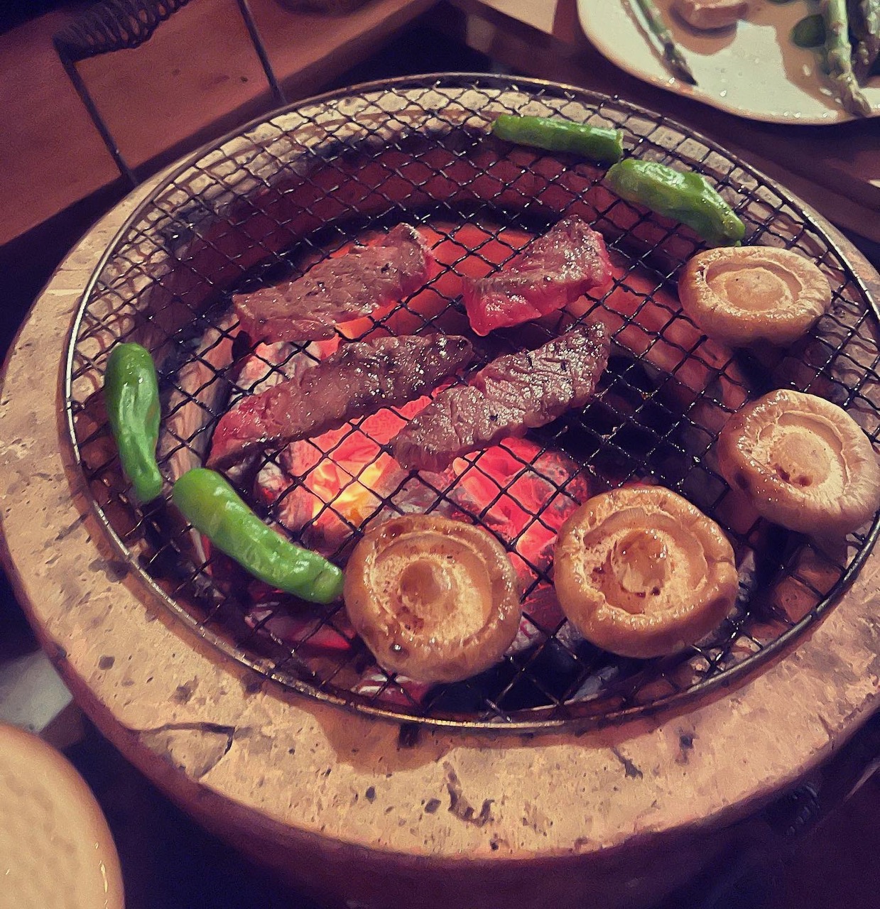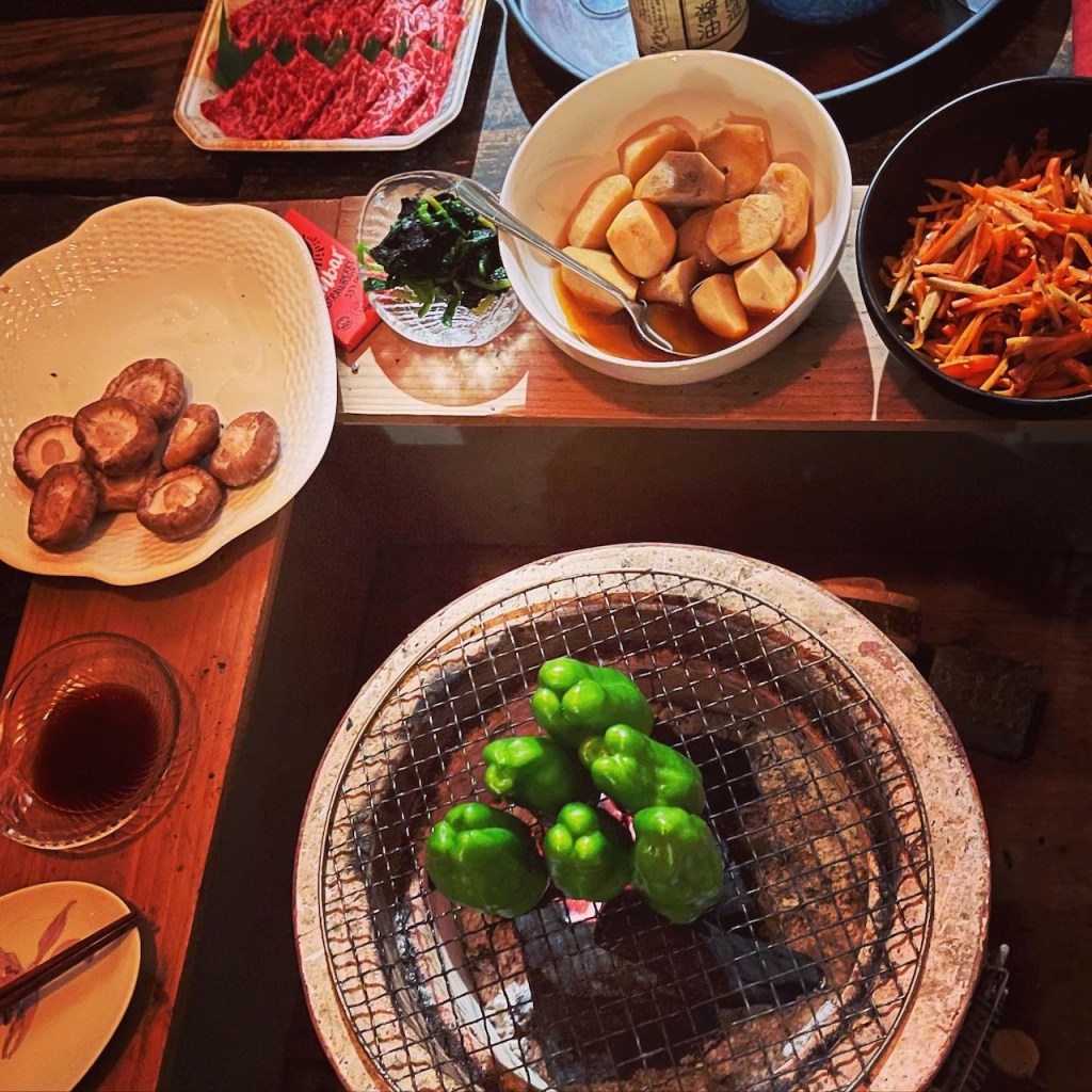 1日目は、シシトウ、アスパラガス、生椎茸、牛肉を木炭でグリル。