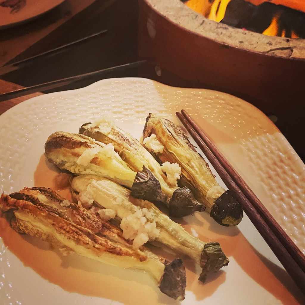 焼きなす、大根おろし、大根と大葉と冷蔵庫で萎びそうになってた水菜に梅醤や千鳥酢、胡麻油入れてサラダ。野菜いっぱいでお腹いっぱい。