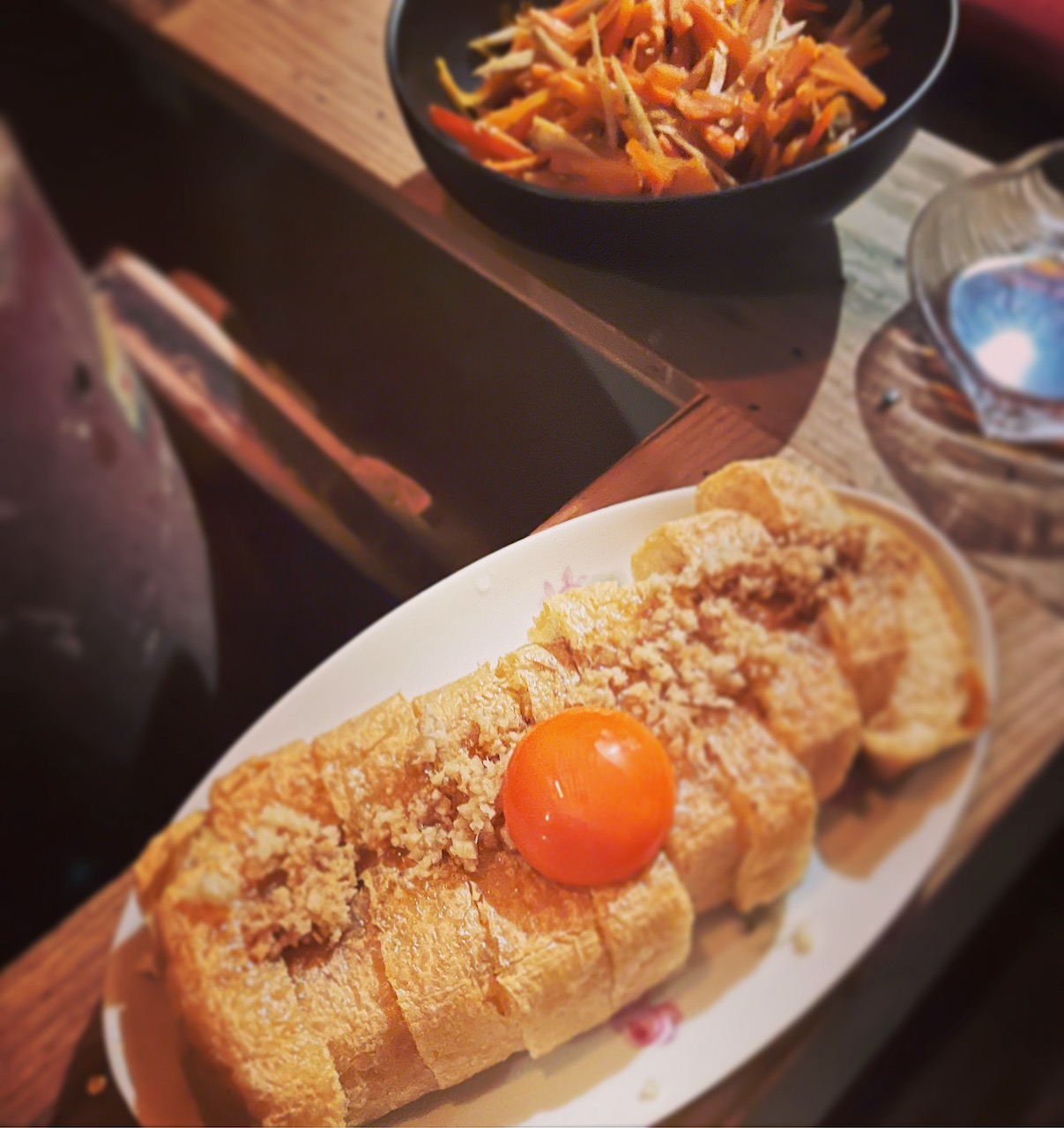 厚揚げ、生姜、甘醤油にma-chanが卵の黄身を載せてくれました。なかなか美味しい。