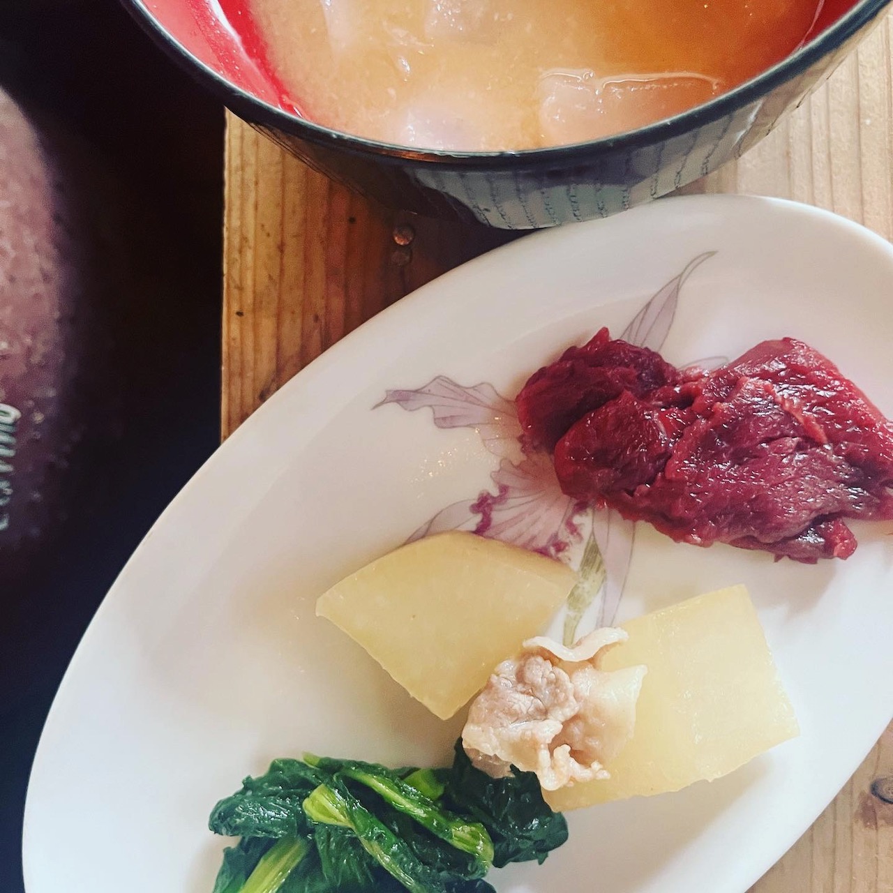 連日食べ過ぎでお腹がぱんぱん。ご飯はお粥で、大根の煮物と菜の花の胡麻油炒め塩味、蕪の味噌汁。煮崩れたのも美味しい。