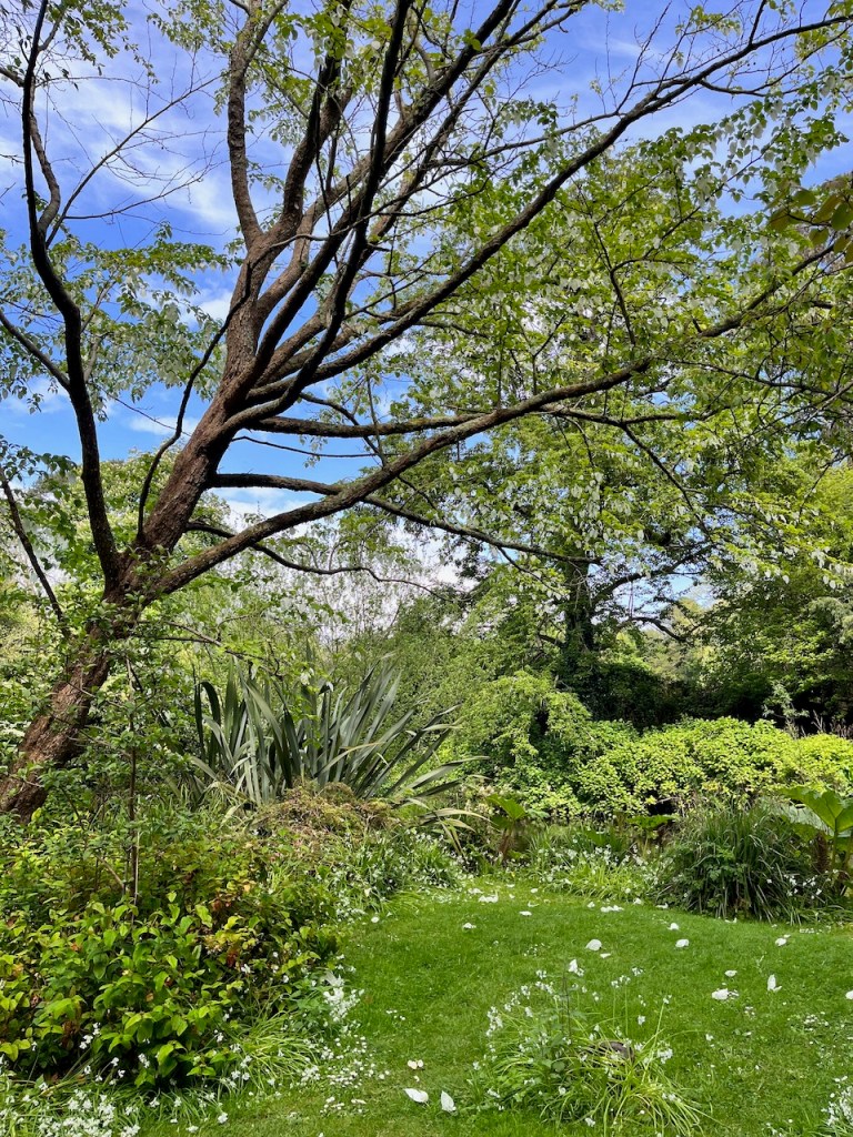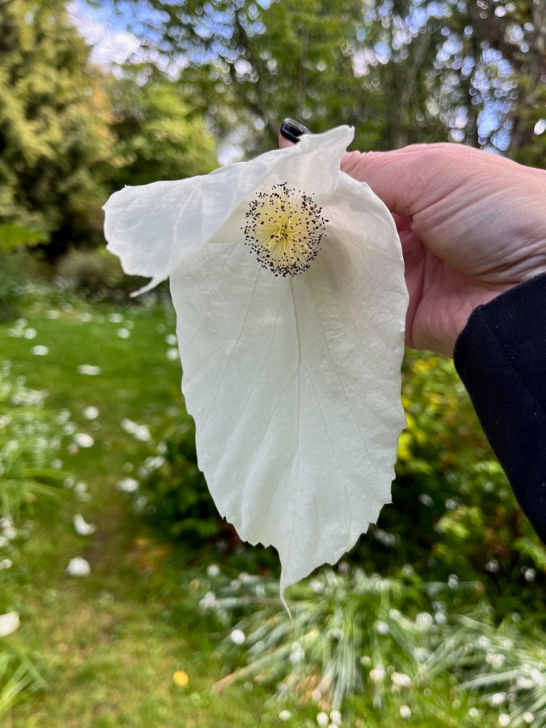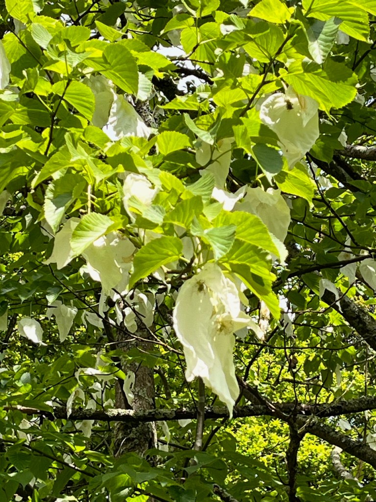 2023.05.09. マウント・アッシャーガーデンの川沿いに、藤の花が咲いているかな?と思って行ってみたら、思いがけなく「ハンカチの木」の花がいっぱい咲いているところが見られました。地面にもいっぱい落ちていたのです。