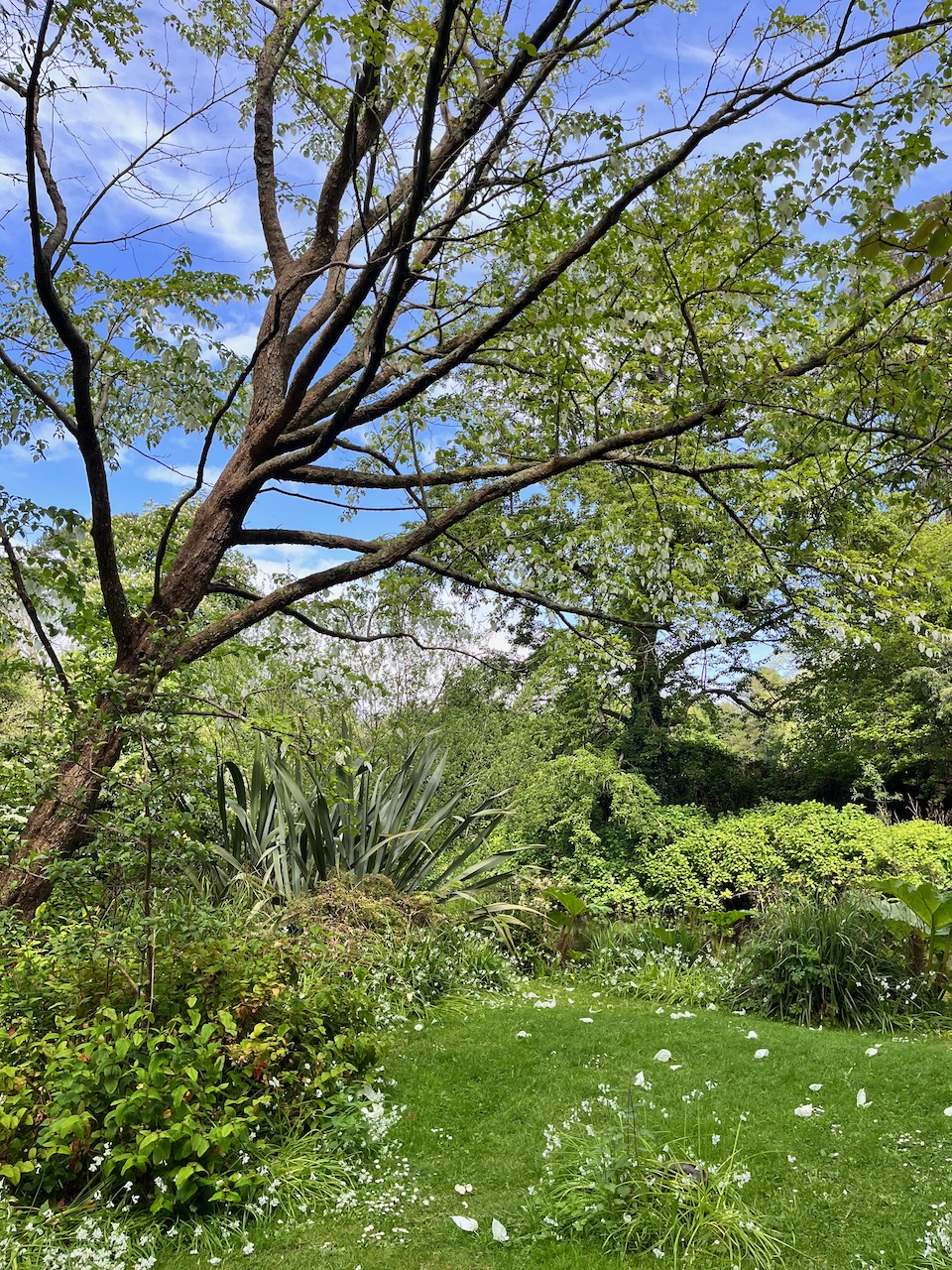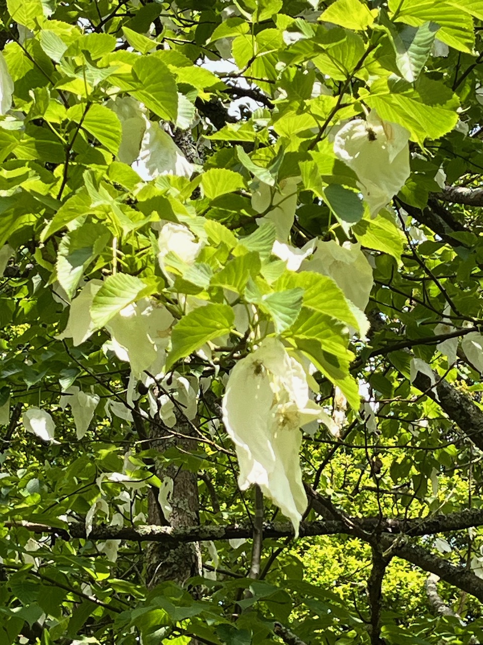 2023.05.09. マウント・アッシャーガーデンの川沿いに、藤の花が咲いているかな?と思って行ってみたら、思いがけなく「ハンカチの木」の花がいっぱい咲いているところが見られました。地面にもいっぱい落ちていたのです。