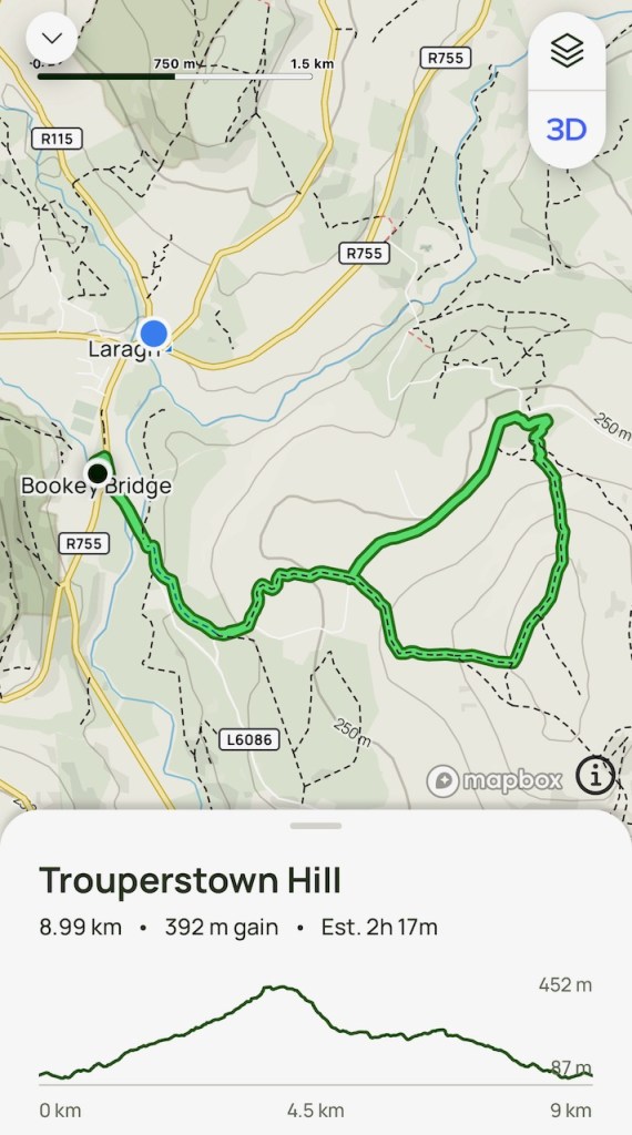 Trooperstown Hill from Laragh car park, 8.99 km elevation gain 392 m. Beautiful morning, felt chilly to start but warmed up quickly as walking uphill. Great view on Wicklow Mountains including Glendalough Valley.