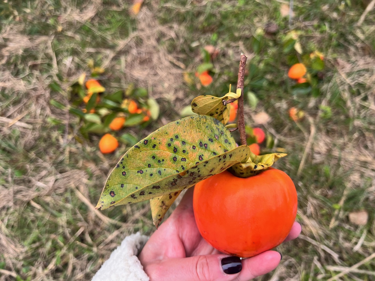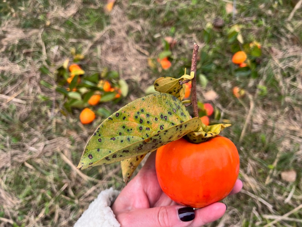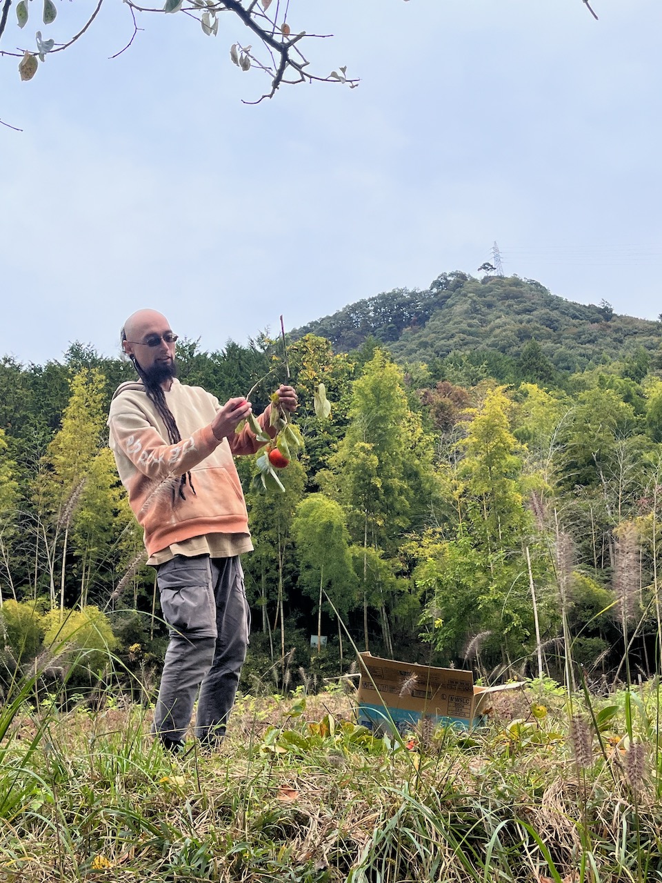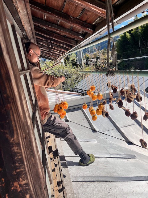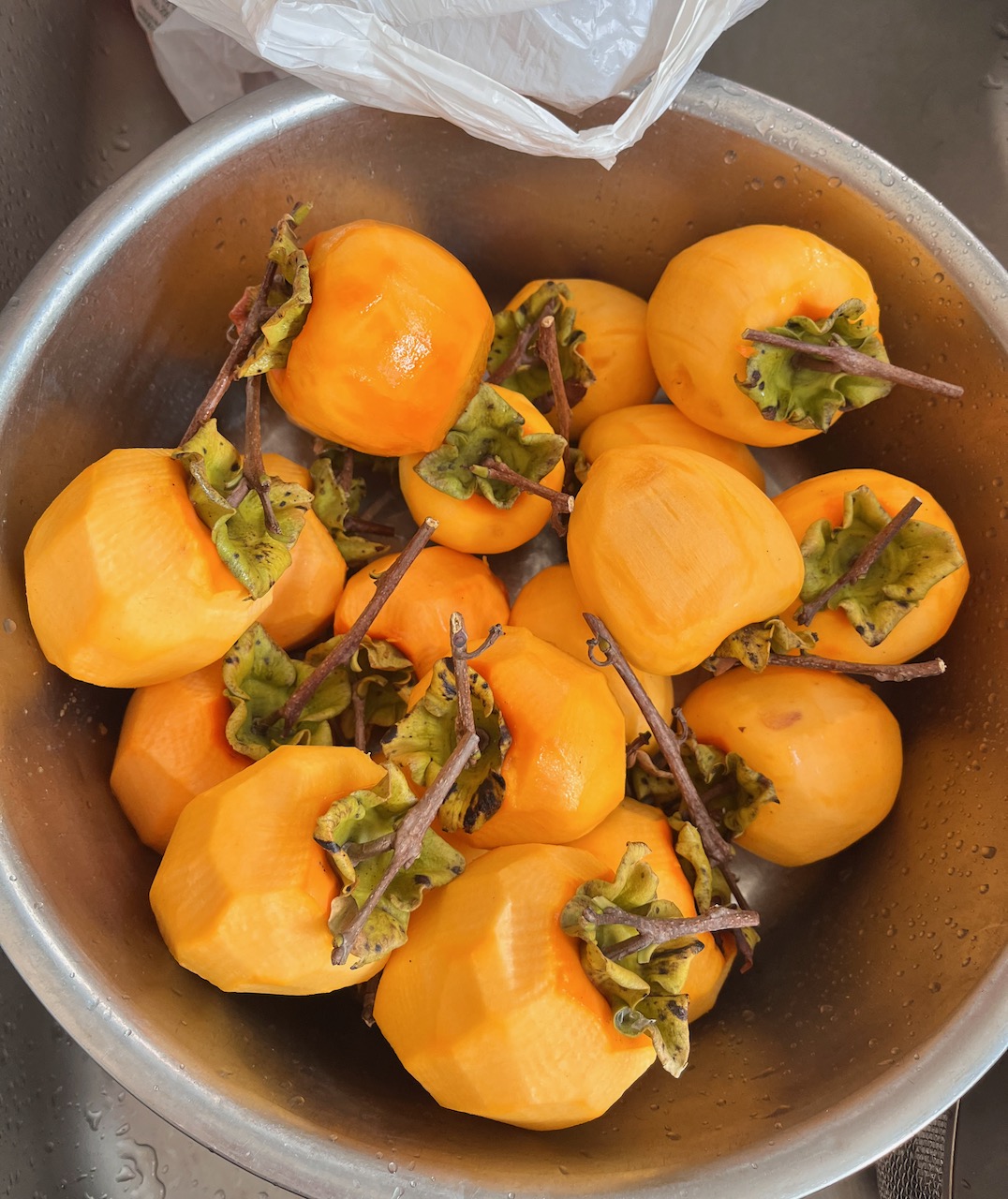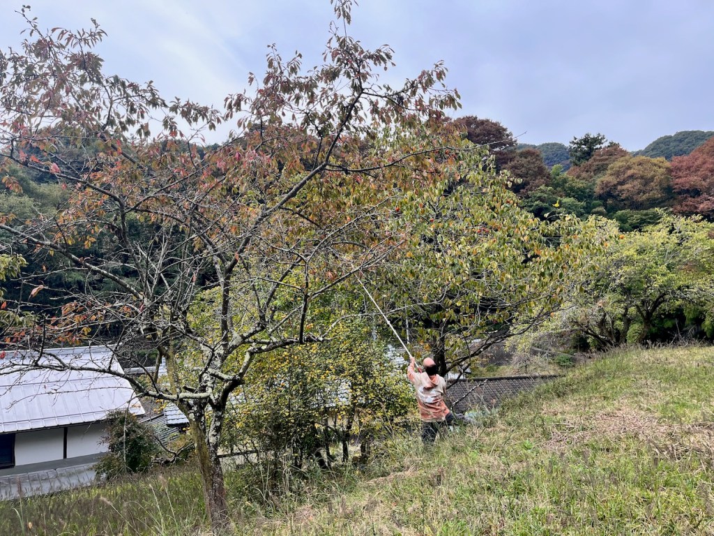 2023.10.25. 家の周りはまだいっぱい柿がなっているので、「追加を作ろう」と柿の実を採りいれ。長い竿の先に切るところがついている道具をうまく使っています。