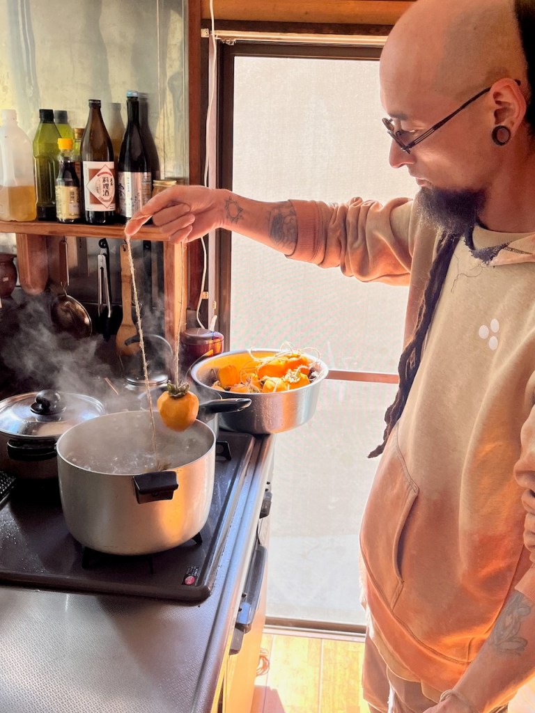 Il y a encore plein de kakis autour de la maison et Masanori a cueilli pour faire sécher un peu plus pour Mayu chan, comme elle adore ces ‘hoshi gaki’ (kaki séché). Je l’ai aidé à les peler et ainsi on a pu voir comment il confectionne tout ça!! Intéressant!!