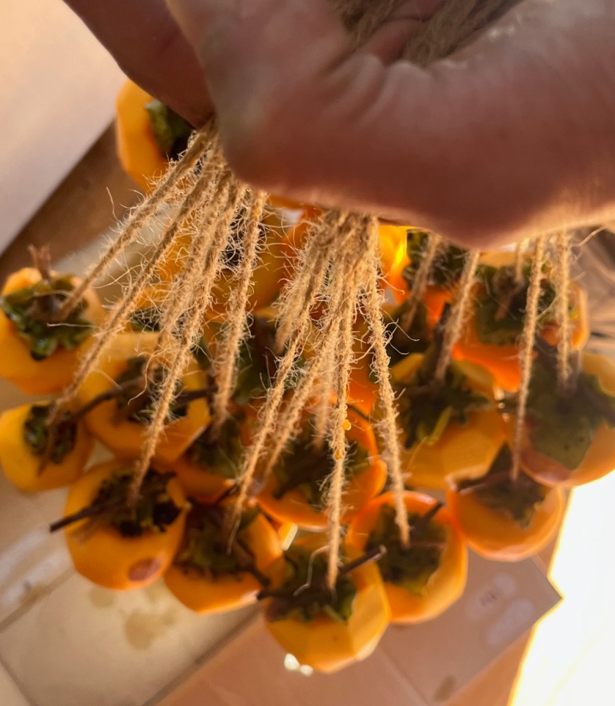 これはみんな渋柿だそうです。皮を剥いて紐をつけたら、ちょっと湯がいてアクをとります。