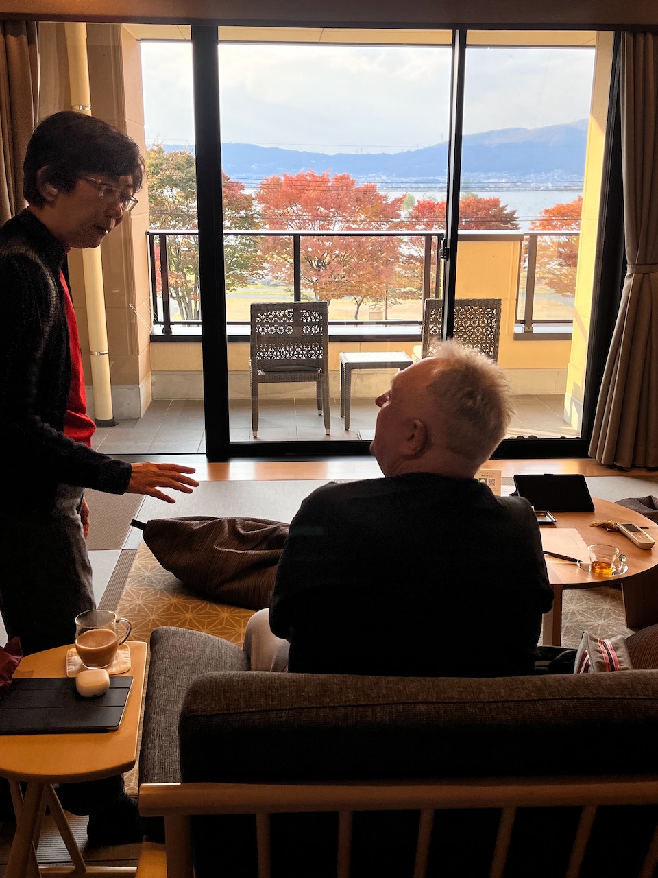 Le but de ce petit tour supplémentaire est d’aller ‘fermer’ notre maison d’été. Il y a maintenant un professionnel qui vient ‘vider’ les tuyaux pour ne pas les faire éclater pendant l’hiver. Le premier soir, un arrêt au lac de Suwa dans notre habituel hôtel de station thermale.