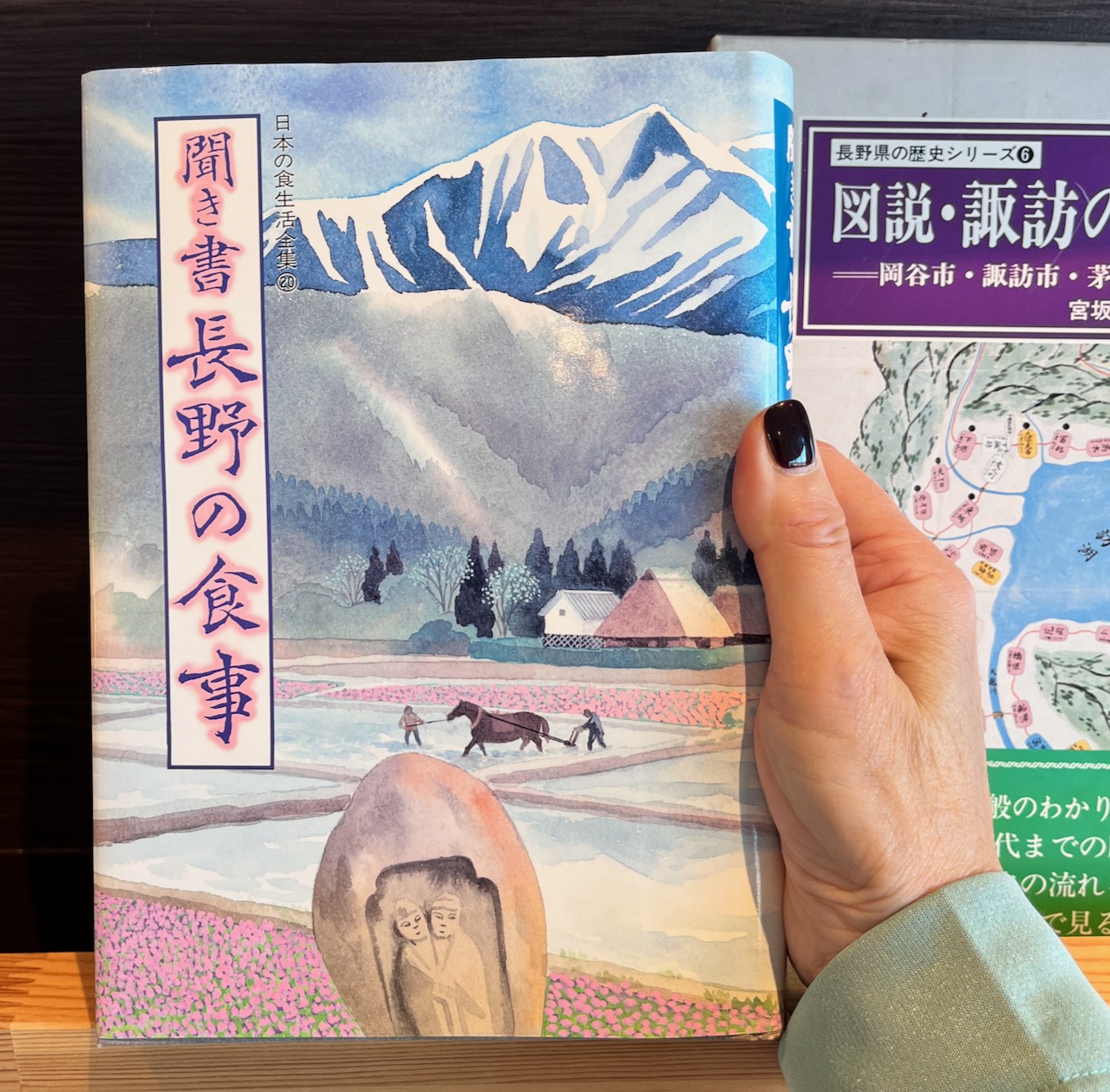 桑畑のある諏訪盆地。水田も作り、そのほか山菜やきのこ、桑畑のあいだにつくる野菜類、柿、さくらんぼ、梅、なつめなどの果樹。川には小鮒やどじょう、鶏もいるし水田も作る。