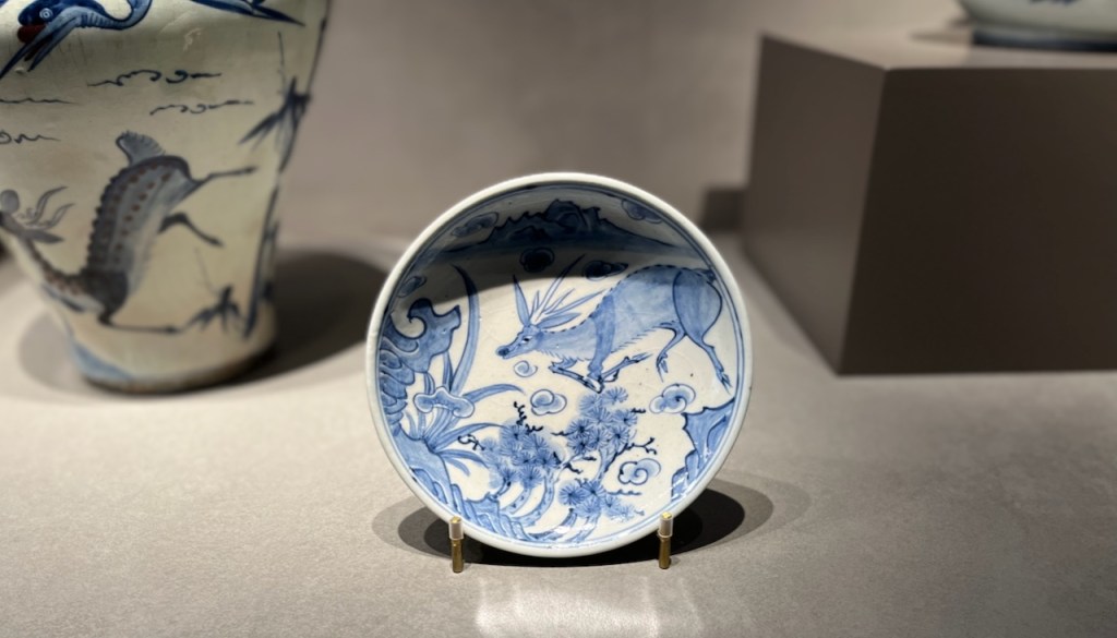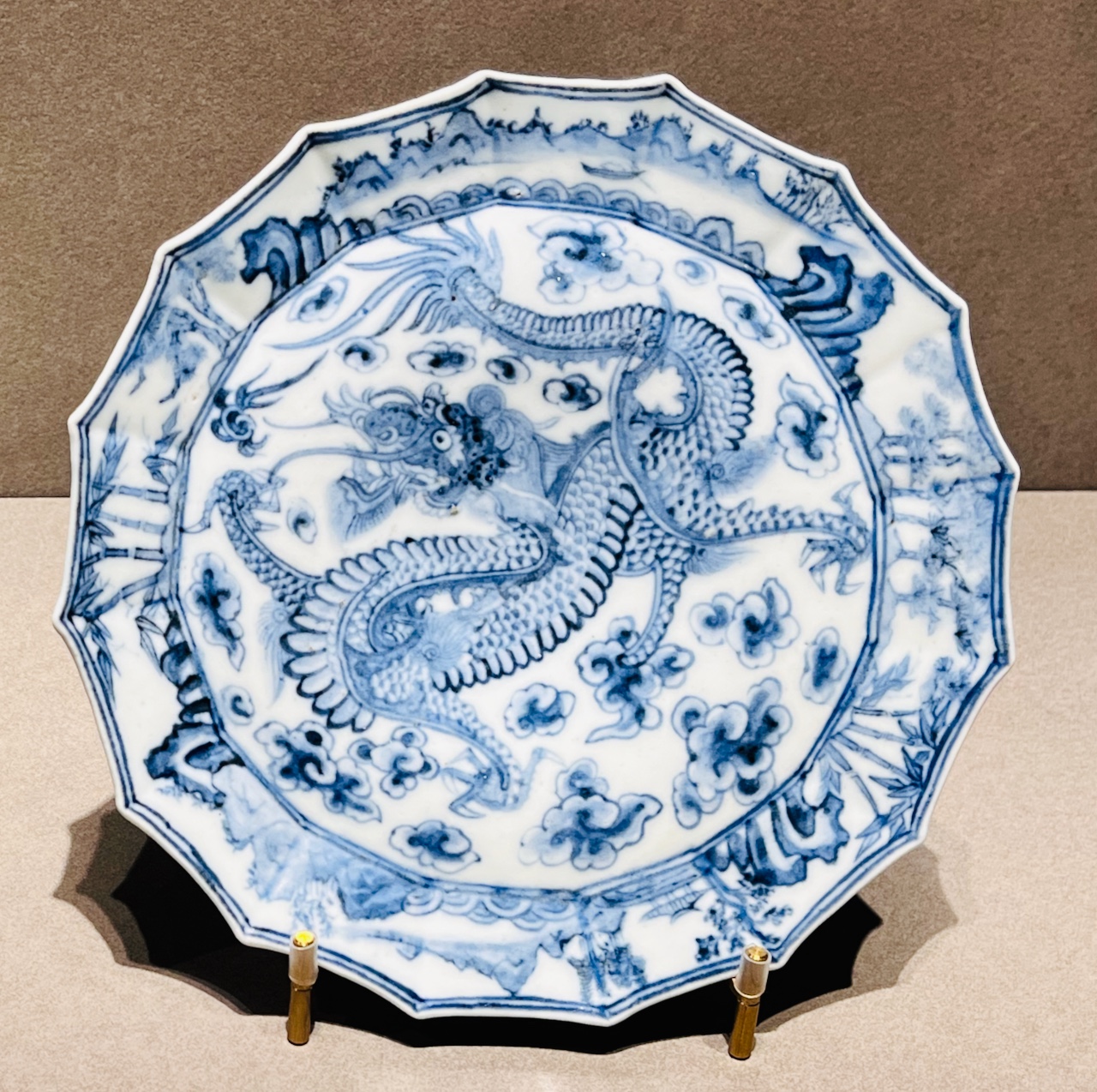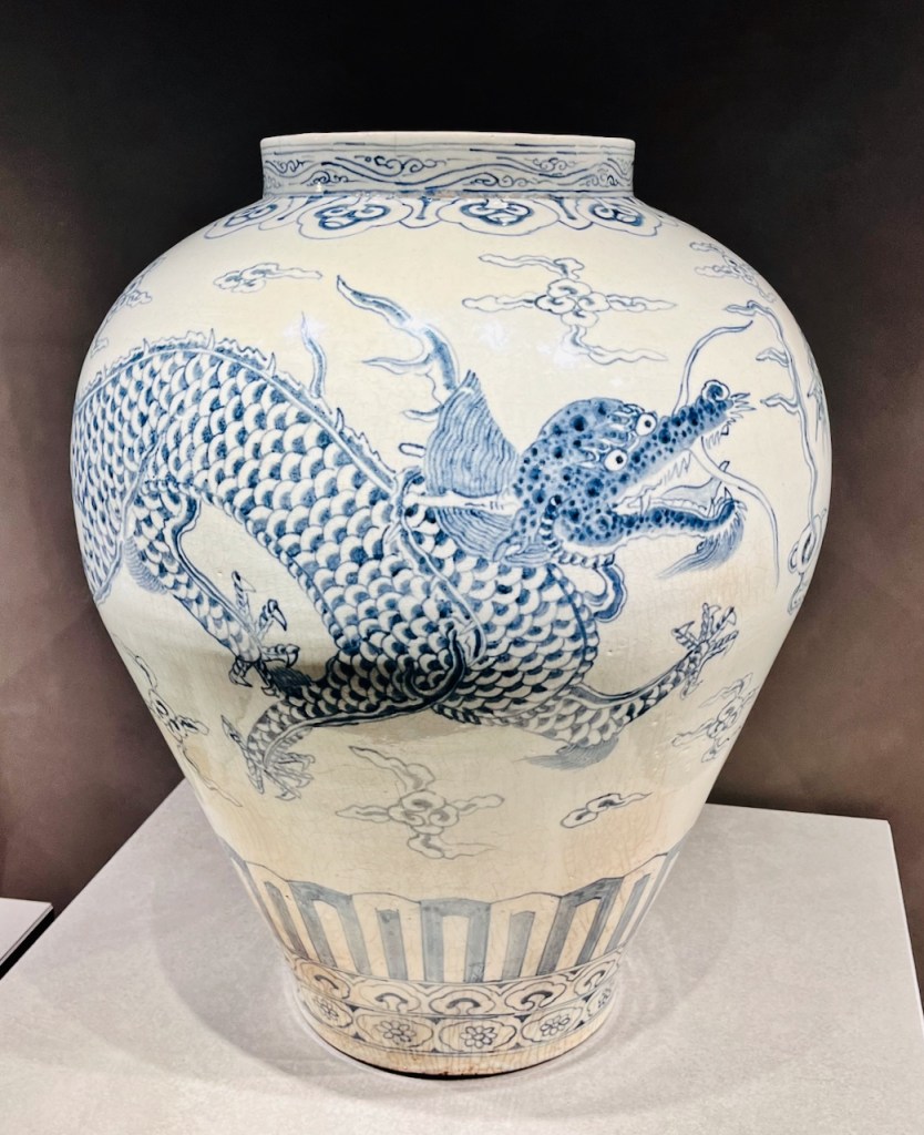 まん丸の目がおどけた顔に見える龍は、王家の儀式の際に花を飾ったものだそうです。技術の粋を尽くした大型の壺。見事という他ありません。