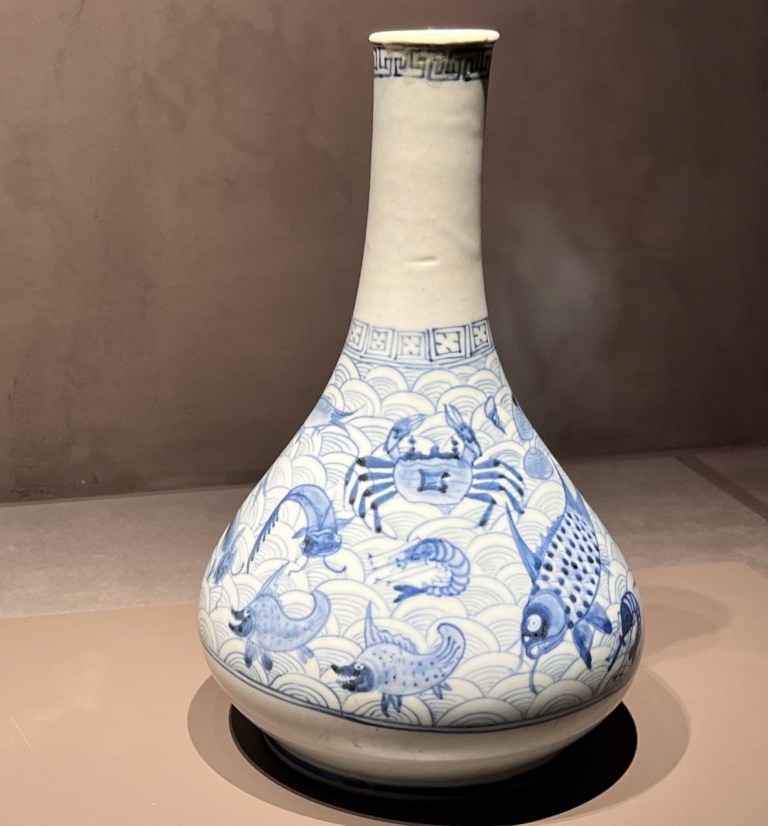 This is a white porcelain bottle decorated with an underwater landscape in cobalt-blue underglaze. The fish, crabs, and shrimp signify fertility and prosperity. These motifs and the shape of the bottle both reflect the influence of Chinese ceramics.