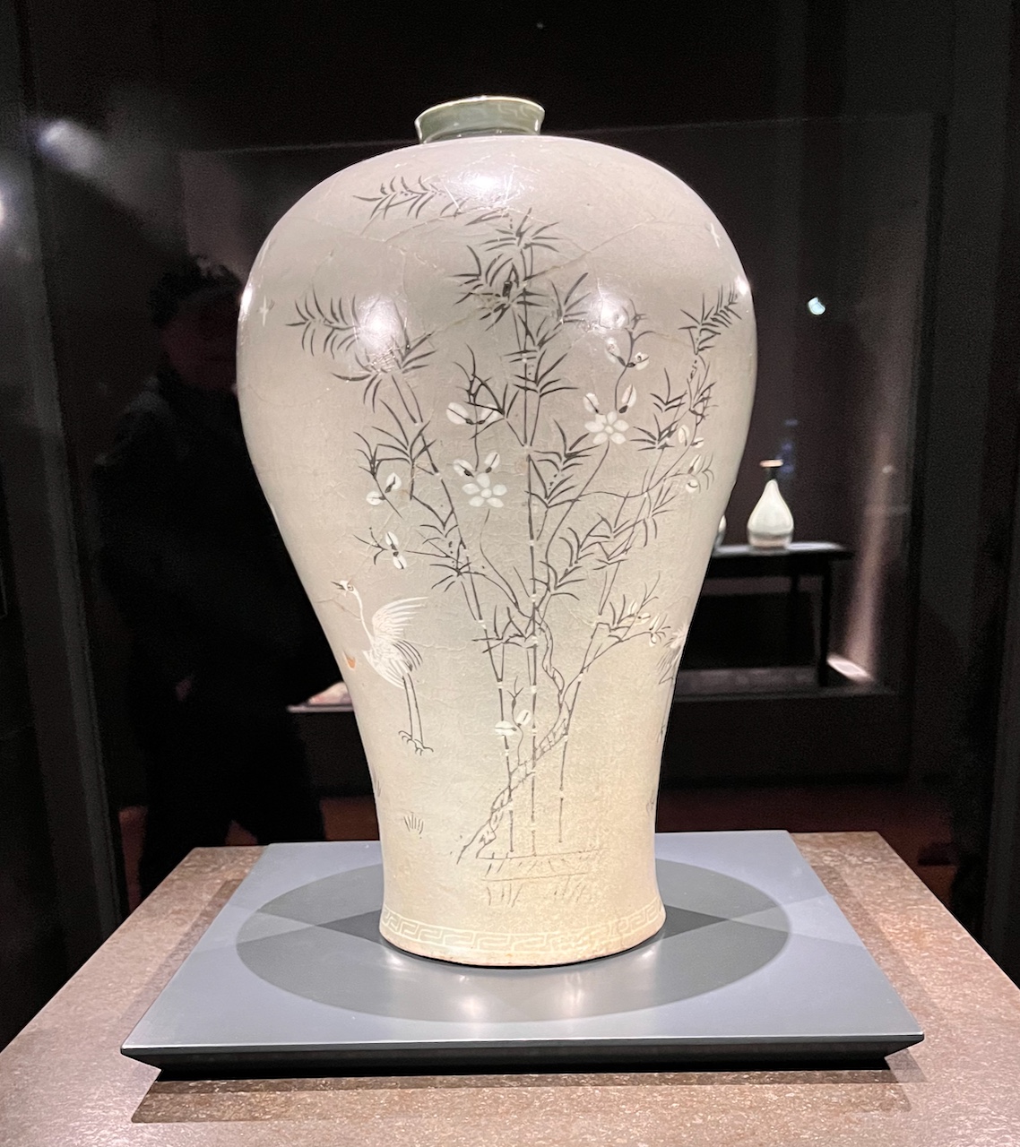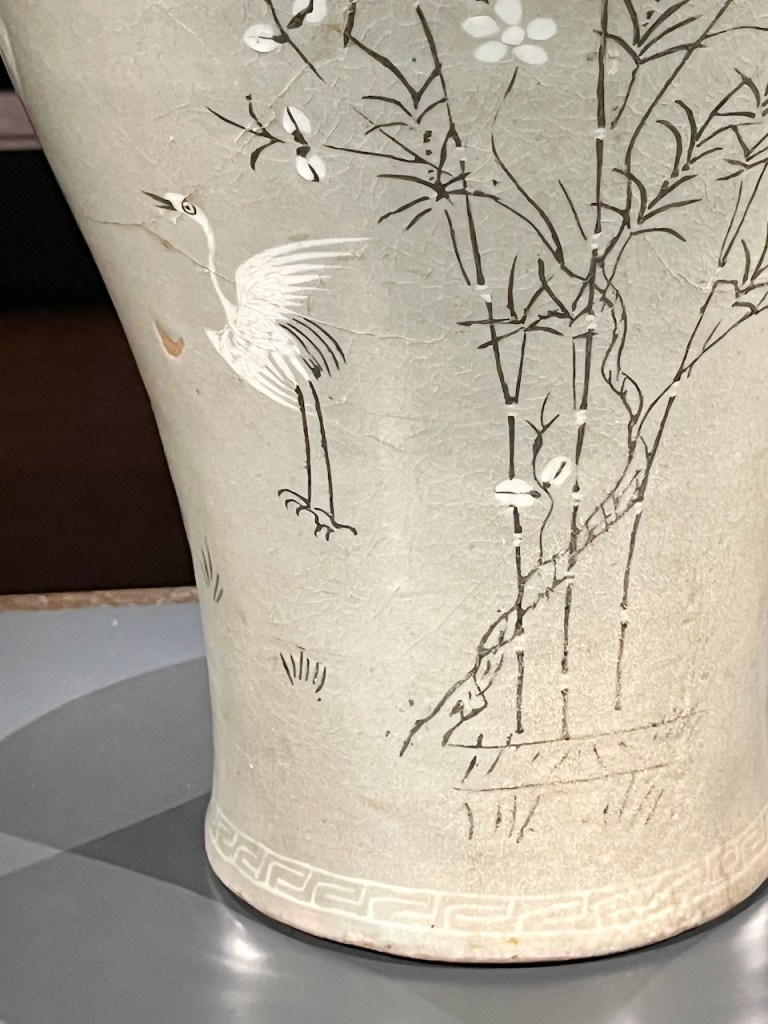 Maebyeong, Vase with Plum Blossoms, Bamboos and Cranes, Celadon with inlaid design