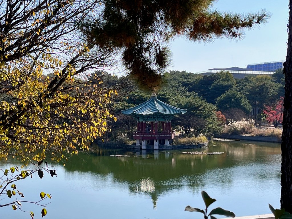 地下鉄の駅を出て大きな建物のほうへ向かうと、美しい大きな池が広がり、さらに現代建築と南山タワーの借景が調和して素晴らしい景色です。