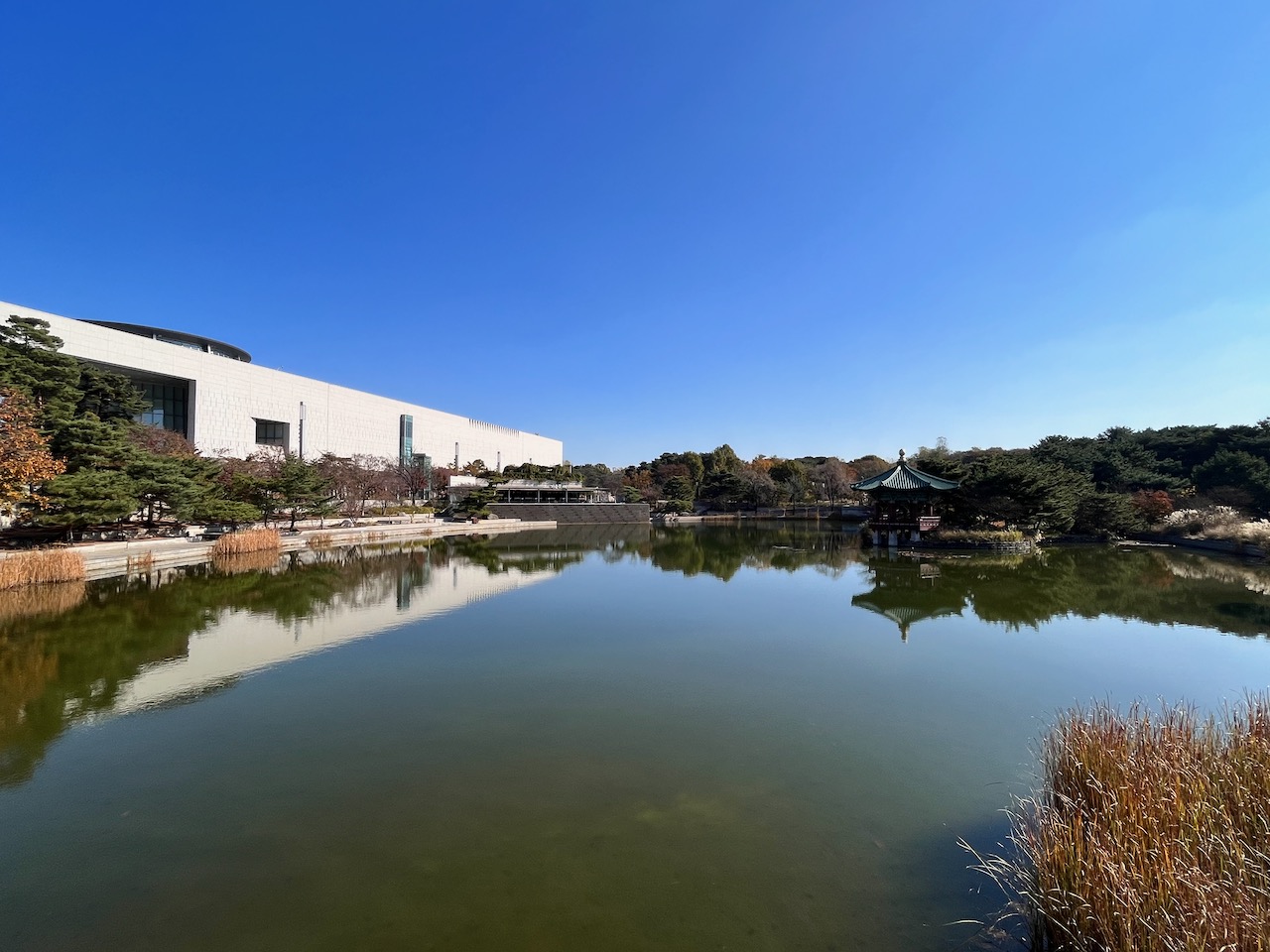 地下鉄の駅を出て大きな建物のほうへ向かうと、美しい大きな池が広がり、さらに現代建築と南山タワーの借景が調和して素晴らしい景色です。