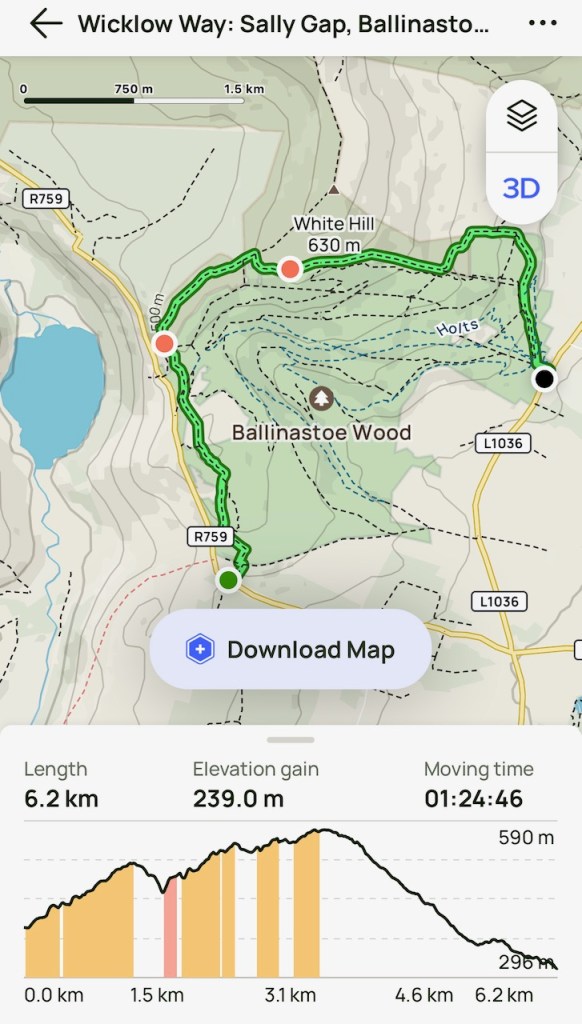 Sat 2 Dec 2023. A quick walk uphill from Sally Gap road side up to JB Mallone rock, across the Barr and down to Ballinastoe Bicycle Car Park, partly on Wicklow Way, to catch up a bit of the part my friends have completed during my stay in Japan.