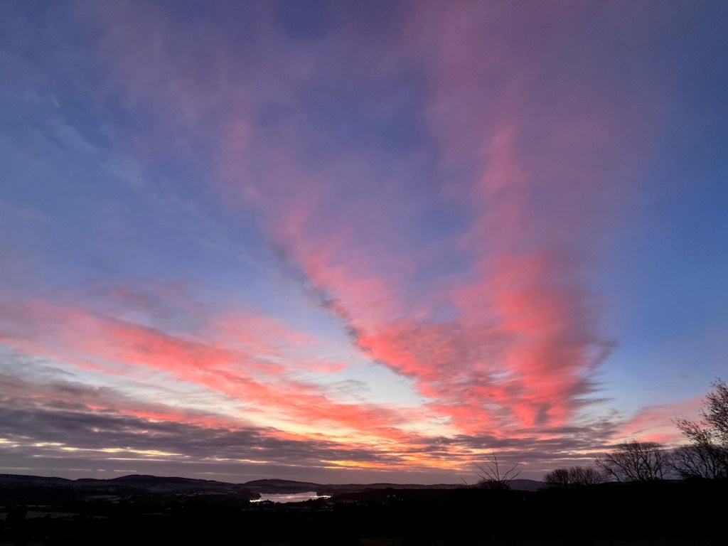 どこか畳の部屋の素敵な料亭のようなところで顔は知らないけどとても親しいひとたちとご飯を食べてお話している。ひとり気になるひとがいて、そのひとに「気持ちが伝えたいのに」と思っているけど機会がとらえられないまま、お開きになって、皆が出る支度をしていると、そのひとが急に私を横へ連れて行って手を取りながら切実な表情で「あなたに逢えて良かった」と言っているのだけど残りがなんとハングルなので聴き取れなくてもどかしい。(あーこりゃ先日のソウル旅行でハングルに浸り過ぎたか😹)一方であっちのほうにもう出て行ってしまいそうな父の背中が見えていて、「あなたの言うことをもっと聴いていたい、ぜんぶ理解してゆったりと話していたい、でも。。。」と思ったところで目が覚めました。時差ぼけって、時間の流れの違ういろいろな世界の交わるところだから、彼岸からも異世界からも誰かが逢いにきてくれるのかな。でも友だちや、家族や、大切に思うひとたちとの時間はいつもあっという間のように感じて、もっと話していたかった、想いは充分に伝わっただろうか、聴き逃したことがあったのでは…とどこかで思っているのかもしれないなあ、それってわたしの生きているほんとうの世界につながっているものね、などと考えています。まだアイルランドは外が真っ暗です。写真は土曜日の朝7:48自宅から見えた朝焼け。