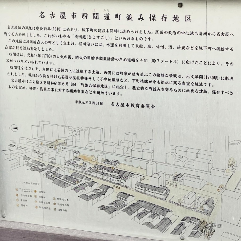 案内板曰く 名古屋城の築城は慶長15年(1610年)に始まり、城下町の建設も同時に始まった。尾張の政治の中心地も清洲から名古屋へ町ぐるみ移転した。いわゆる「清洲越(きよすごし)」といわれるもの。この地区は清洲越商人の町として生まれ、堀川沿いには水運を利用して米、塩、味噌、酒、薪炭などを城下町へ供給する商家が軒を連ね繁栄した。
