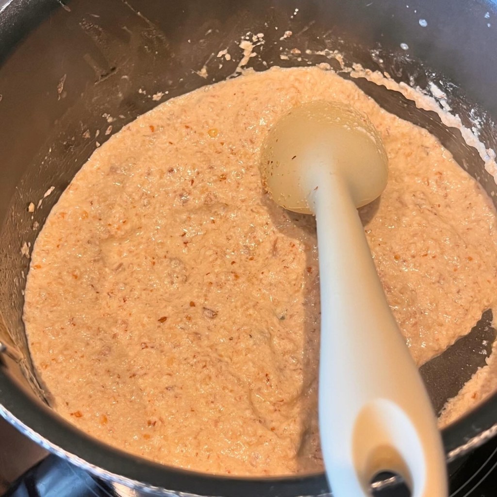前菜の胡桃のソースは、豆乳+にんにくを煮込む+ バターで溶かしたアンチョビを加え、ブレンダーで粉上にした胡桃を加えるもの。