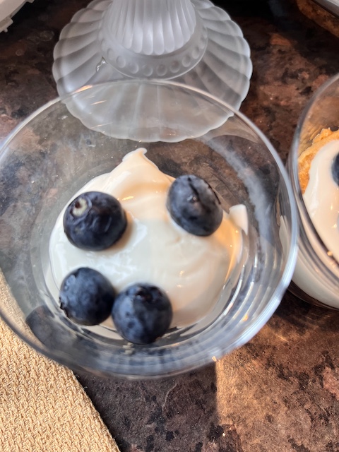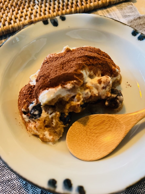 器に、ブルーベリー>コーヒー+器の大きさに合わせてちぎって洋酒のシロップにさっと漬けたビスケット(すぐにふにゃふにゃになる!)>クリーム>またブルーベリー>ビスケットのシロップ漬け>最後はクリーム と重ねる。