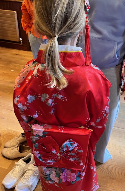 ちっちゃな嬢ちゃんが自前の「キモノ」で来てくれたら、背中の「帯」はお弁当箱みたいな四角いのをマジックテープでくっつけるようになってる。