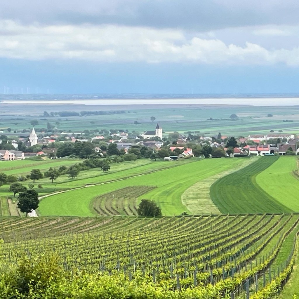 村の周りは葡萄畑が若葉の季節で高台に登って行くと向こうに見えるのはノイジーデラーゼー。