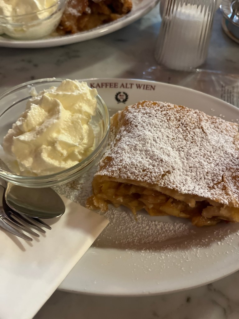 いっしょにカフェでお茶をして アップルシュトルーデルというパイ皮で包んであるお菓子を食べました。美味しかった!