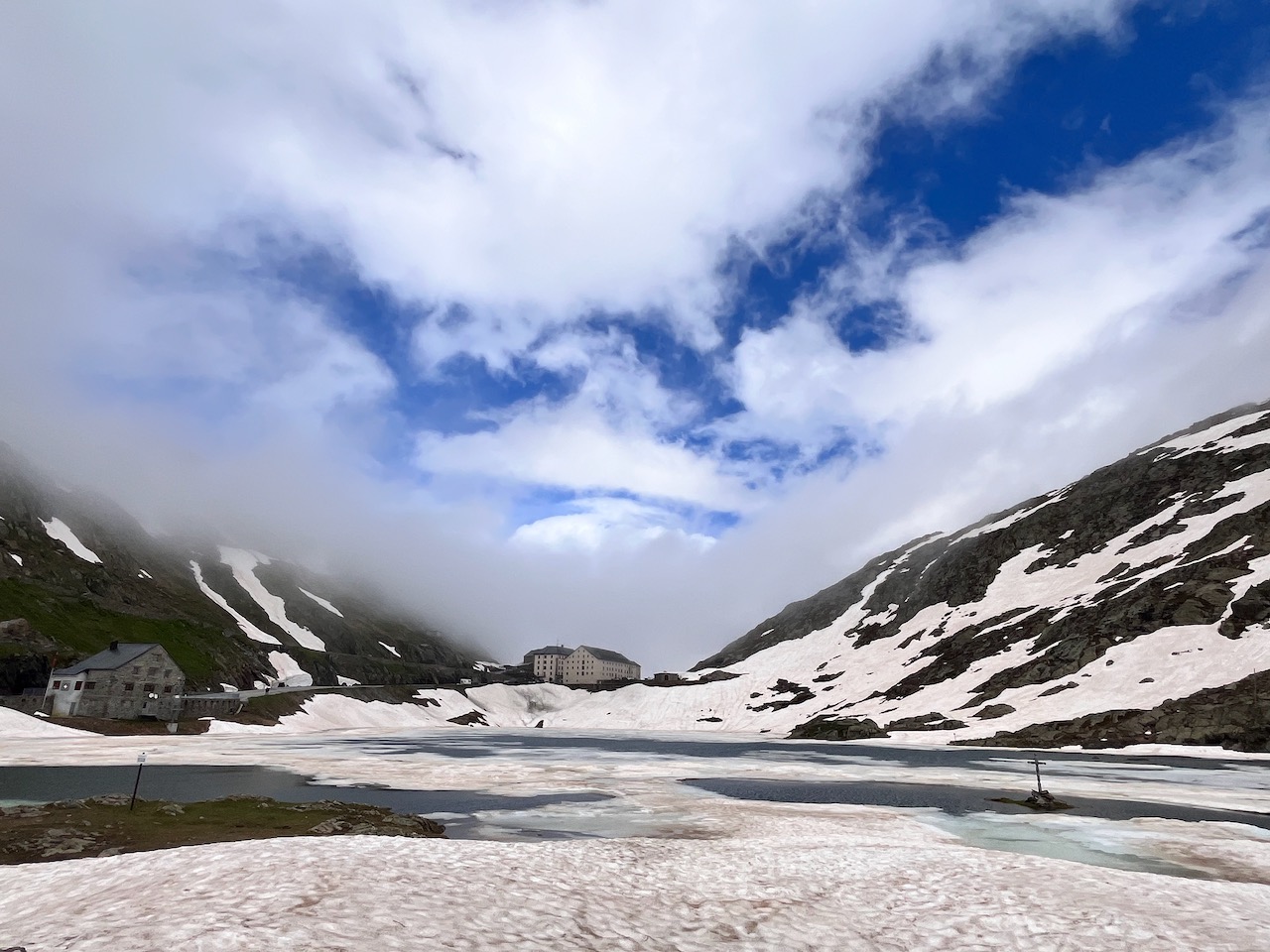 登りきった峠の部分にあたるグラン・サン・ベルナールに到着すると、湖が凍っていました!!