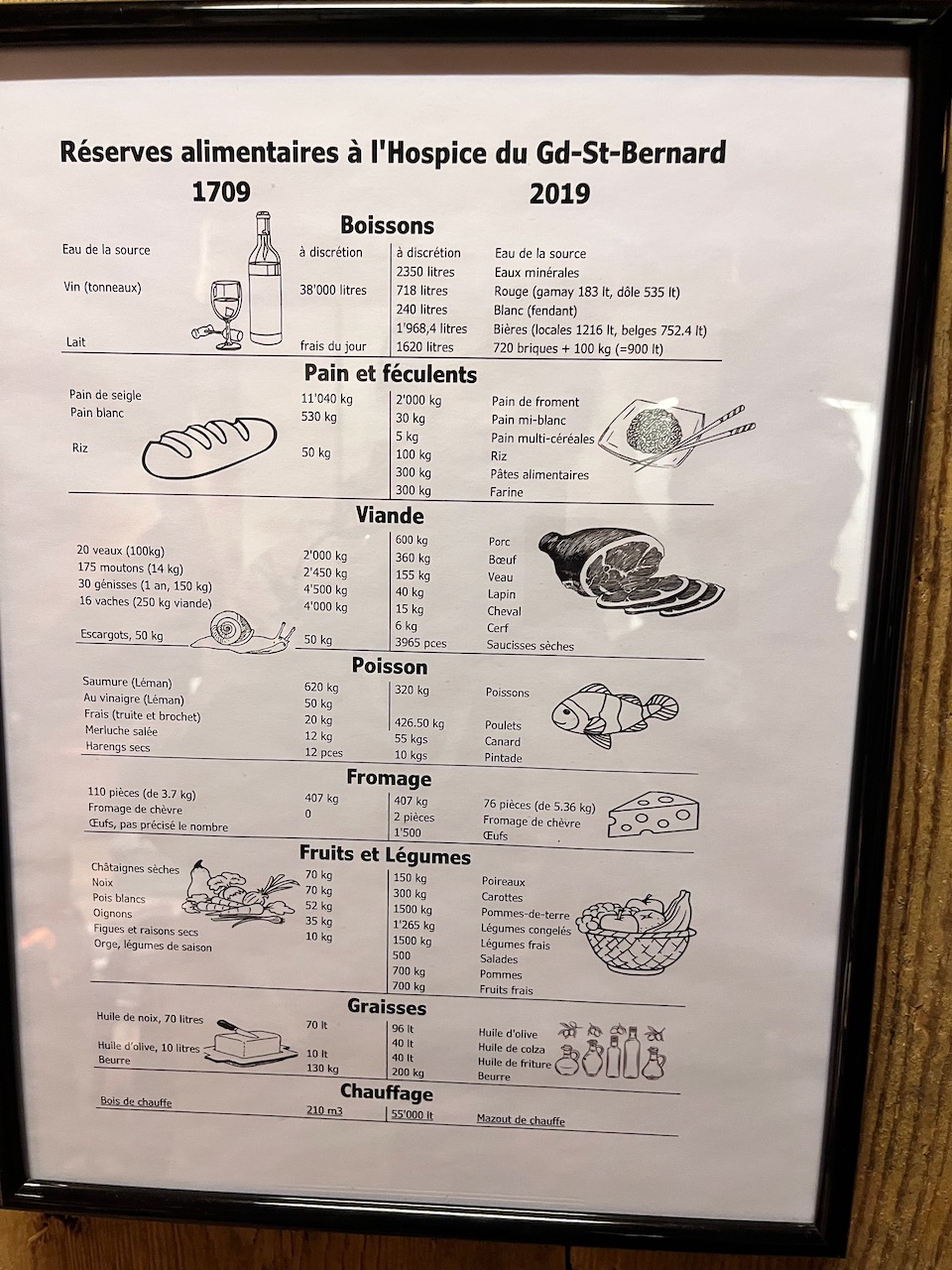 Grand Saint Bernardの博物館で、昔 お宿で出していた食事と、現代(2019年)の比較の表があったのです。