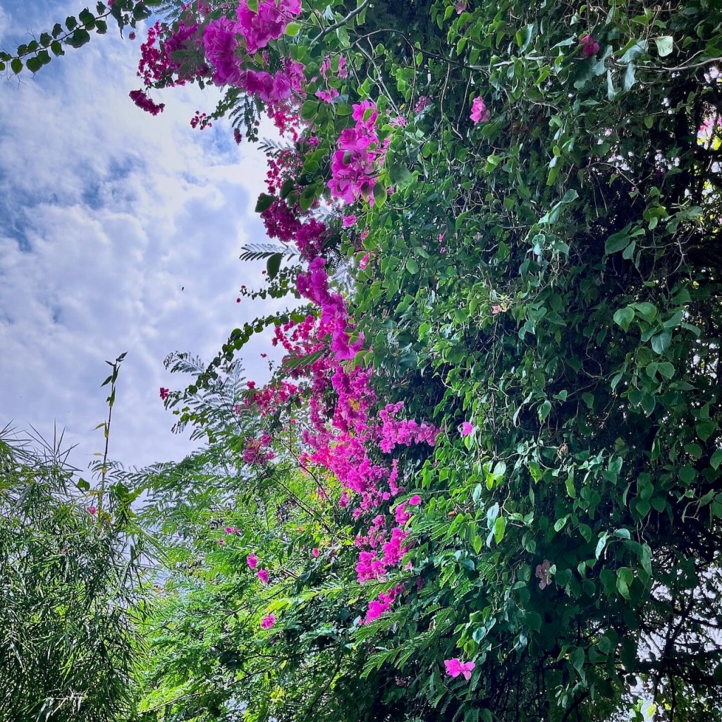 裏門を出て坂を下ると、鮮やかな色のブーゲンビリアの花が頭の上にたくさん咲いていました。
