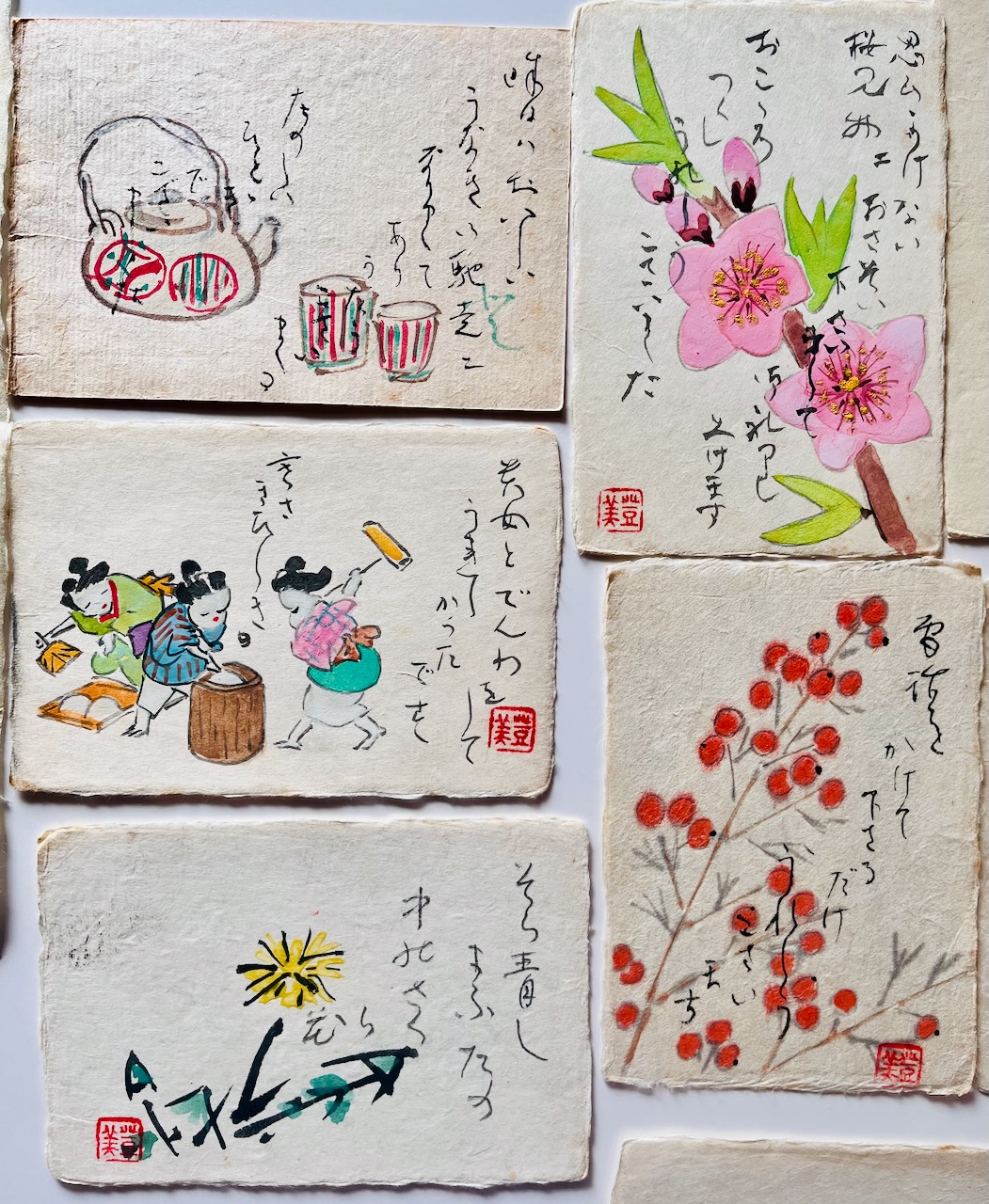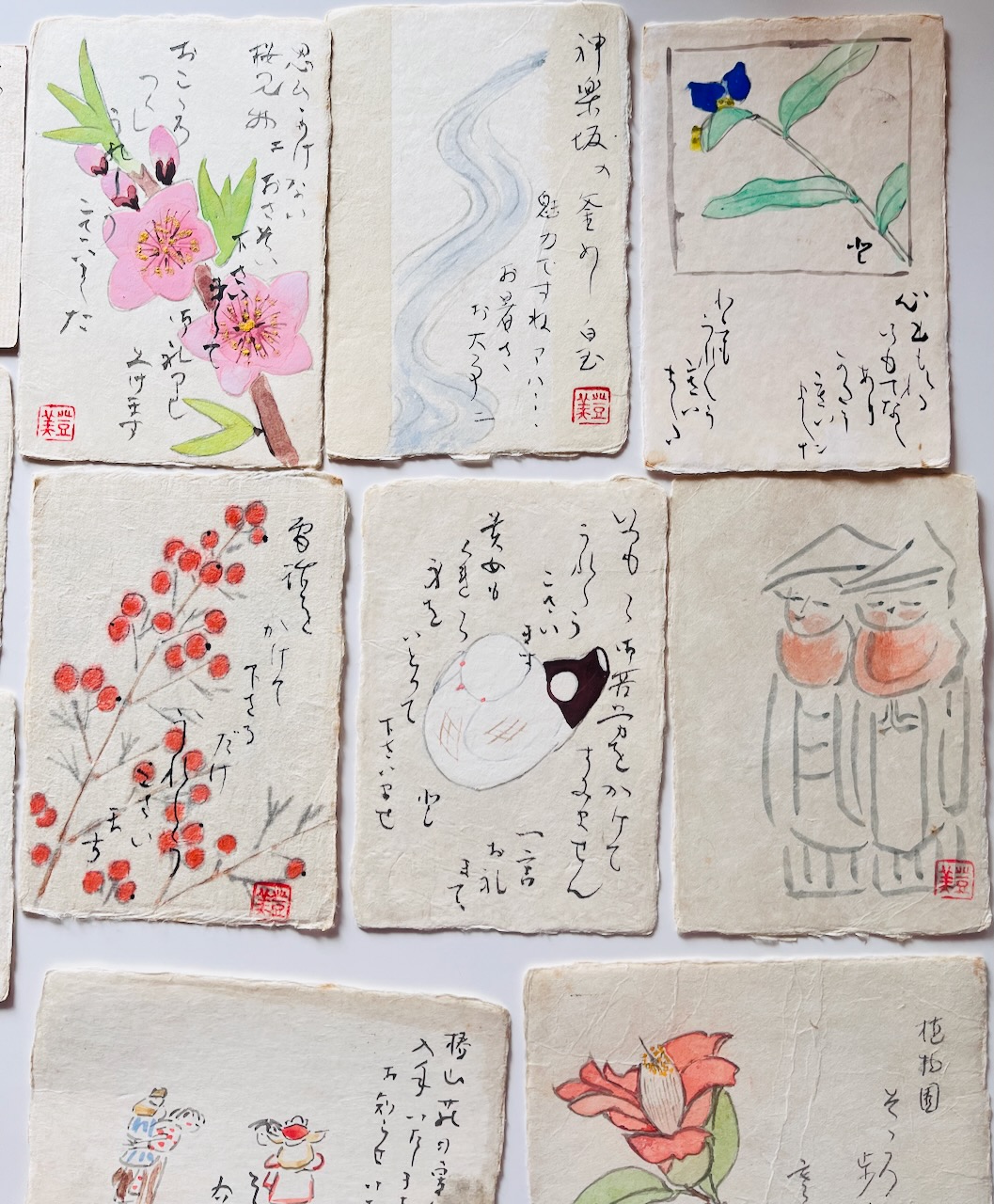 父方の祖母が母にたくさん送った葉書。季節の美しいものやユーモラスな人物を自分で描いたところへメッセージを添えてちょっと送ったものが大切なコレクションになっていたのです。