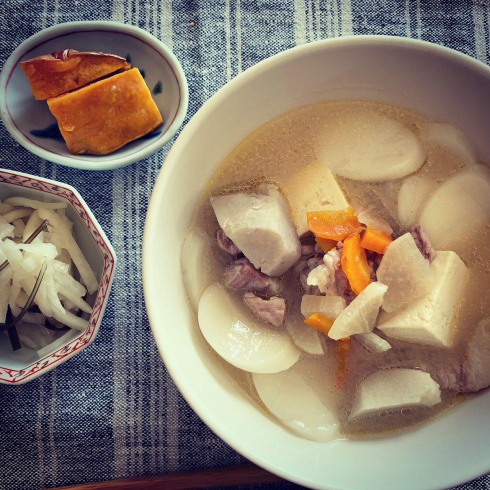 豚汁に韓国のお餅 soupe de légumes avec la pâte gluante koréenne